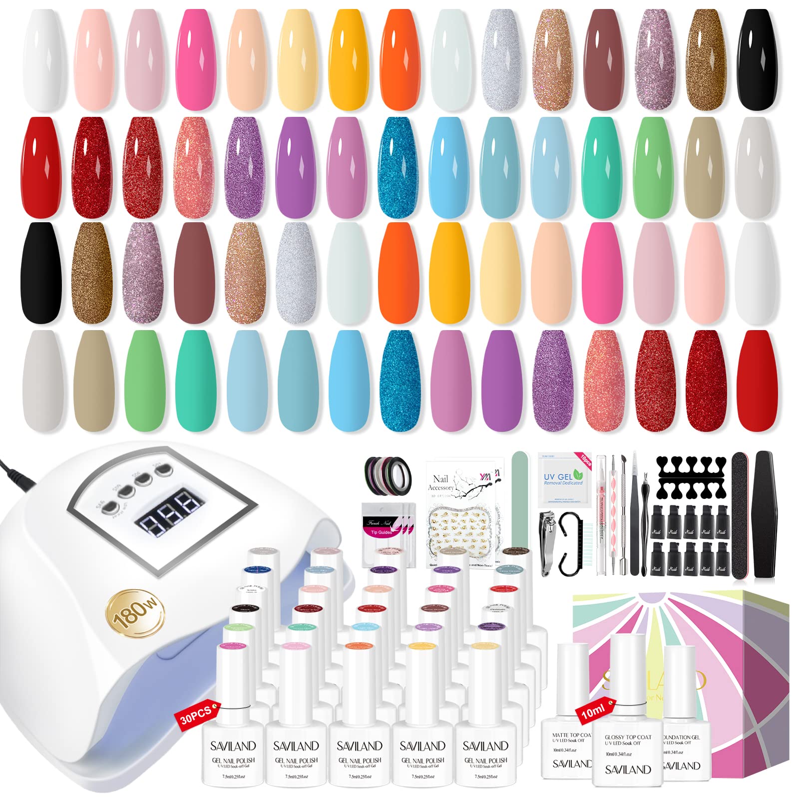 ?WARM TIPS & SERVICE?Do a skin allergy test before use. If you have any problems with this all-in-one gel polish nail kit, please feel free to contact us, and we will do our best to help you. Thanks for choosing Saviland. Happy shopping~. ?Easy To Use & Long-Lasting?Saviland gel nail polish has great smoothness and easy application. With a proper application, that can keep lasting up to 3-4 weeks. Perfect for starters and professionals to DIY nail designs at home or in professional nail salons. You don't have to buy other stuff with this gel nail polish with U V light starter kit. ?Healthy & Safe?Saviland 30 exclusive trendy colors gel nail polish is made of natural resin, low odor, vegan & cruelty-free, 11- toxin free, which makes it safe. gel nail starter kit has no harm to your nails and skin and is only used for nail and Non-direct contact with the skin. Suitable for starters and professionals with glossy, matte top gel and everything you need. ?Five Times Faster 180W U V Light?Saviland gel nail kit with U V light offers 80% faster curing speeds than lower-wattage UV nail lamps. 180W powerful U V/LED nail lamp with 45 pieces of durable LED beads, can cure all kinds of gel nail polish with everything, foundation gel, and top gel quickly from every angle! It has 4 smart timer modes that you can choose by your need, which is no harm to your eyes and skin, and no black hands by these gel nail kits with heat dissipation. ?All-in-one Gel Polish Kit?Saviland gel nail polish kit has 30pcs gel nail polish, 1pc matte top gel, 1pc foundation gel, 1pc glossy top gel, 1pc U V light, 10pcs nail remover pads, 10pcs soak off cap clips, 1pc cuticle oil pen, 1pc tweezers, 2pcs packs of nail decorations sticker, 3pcs packs of french nail sticker strips, 5pcs nail striping tapes, 1pc cuticle pusher, 1pc cuticle trimmer, 1pc nail brush, 2pcs nail separators, 1pc dotting pen, 2pcs nail file, 1pc nail buffer, 1pc nail cutter.Best Sellers Rank: See Top 100 in Beauty & Personal Care. Finish Type: Glossy, Matte. Included Components: Base Coat, Gel Nail polish. Brand: SAVILAND. Material: Acrylic. Color: A-30 Colors Vibrant Spring. Country of Origin: China. : B09YRST6TJ. Manufacturer: Saviland. Package Dimensions: 9.6 x 8.4 x 7.8 inches; 4.25 Pounds.