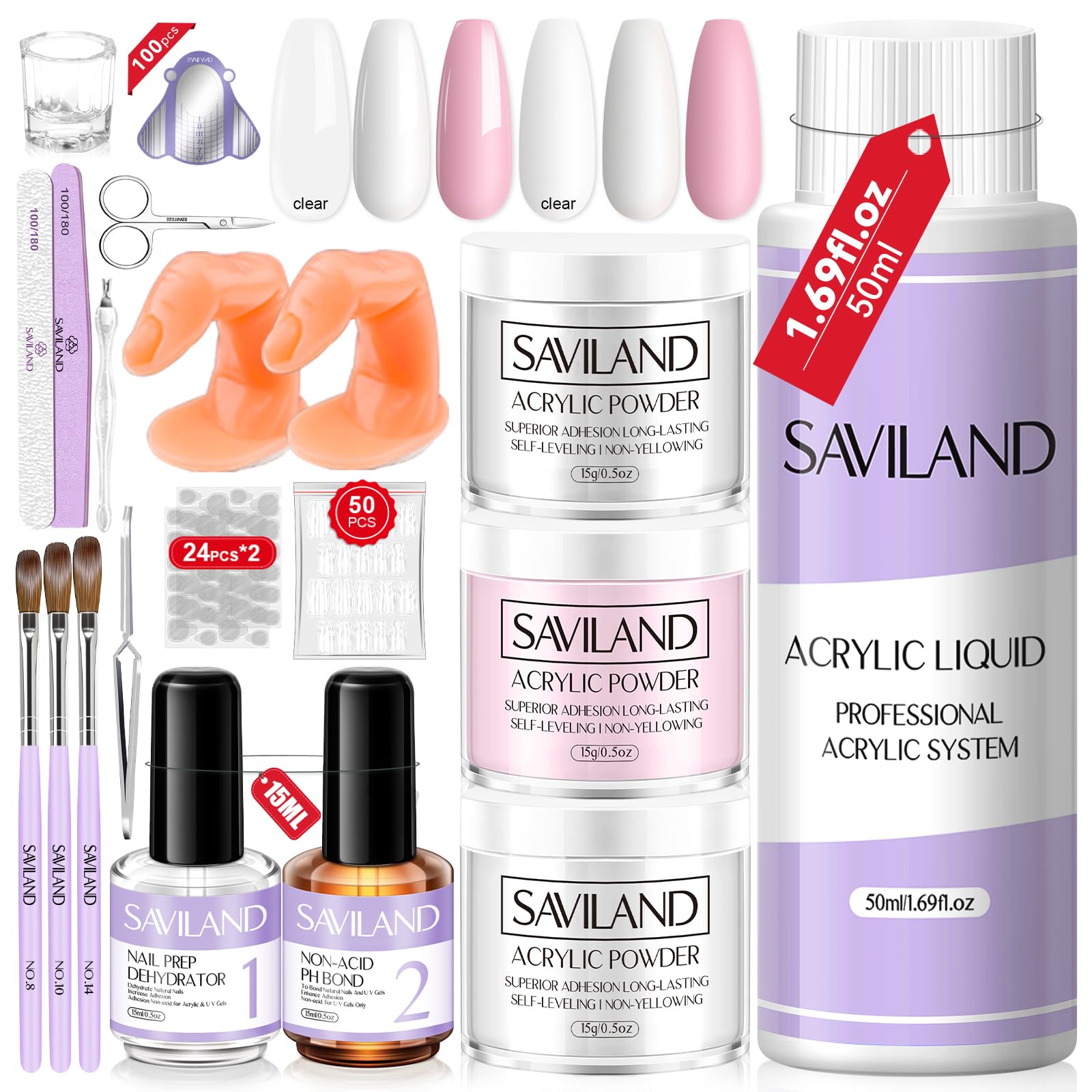 Warm Tips ServiceKeep acrylic powder and acrylic liquid away from sunlight and heat. If you have any problems with Saviland all-in-one Acrylic Nail Kit, please feel free to contact us, we will do our best to help you. Premium Natural MaterialCrafted with high-quality fine nail acrylic powder and EMA acrylic monomer liquid, this Saviland kit guarantees a safe and healthy manicure application process, free from harmful chemicals, while emitting minimal odor for a pleasant nail art experience. Acrylic Nail ToolsThis Saviland all-inclusive nail art set contains a wide range of nail essential practice tools, ensuring beginners can effortlessly enhance their skills in crafting exquisite acrylic nails. There is no need to buy other acrylic nails tools, which is very convenient. Premium Acrylic Powder Acrylic Liquid SetSaviland acrylic nail powder is ultra-fine and can be used for nail extension carving. With premium EMA acrylic liquid, the acrylic nail art can last for 28 days. Acrylic Nail Starter KitSaviland acrylic nail kit for starters contains 3 colors of acrylic powder and 50ml acrylic liquid, 3 different sizes of acrylic nail brushes (8 10 14), 2 pcs nail practice fingers and some basic nail tools to meet the nail art needs, includes everything you need to get started acrylic nails art, take a try!.