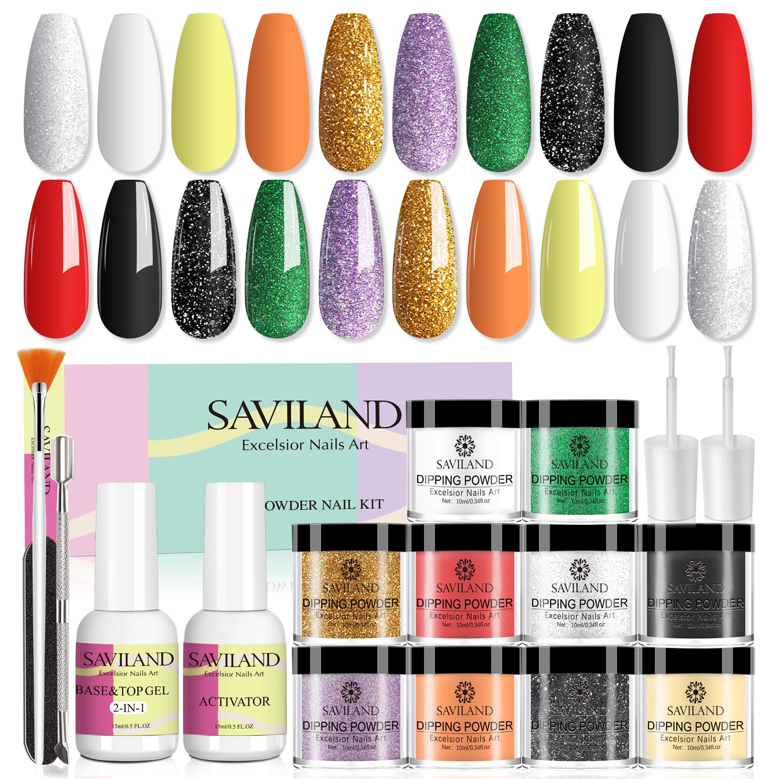 WARM TIPS & BETTER SERVICE?A skin test must be performed before use. Stop using it as soon as you feel unwell! Different light sources, monitors and coating owns different color shade, subject to actual product. If you have any questions about this dip powder set, please contact us in time, we will try our best to help you. Thanks for choosing Saviland. Enjoy your shopping~. PERFECT CHRISTMAS GIFT?Saviland colored dipping nail powder set makes from natural resin, odorless and 9-free, helping nails grow stronger and healthier. No need UV/LED lamp for curing, avoid the risk of skin damage and is friendly to the nail bed. It’s perfect Christmas gift for your friends who love nails arts. HIGH-QUALITY & LAST LONGER?The colorful and glitter dipping powder kit is long-lasting and chipping resistant. Professionally formulated, Saviland dip powder starter set is free of harsh chemicals and offers natural shiny nails look. It can keep the nail art gorgeous and shiny for more than 3 weeks. SUPER EASY TO HANDLE?Comes with detailed instructions, this nail dipping powder kit is friendly to beginners. Does not require monomer to activate and no nail lamp needed, either. Dry fast and it's also surely safe and easy to handle for both professionals and home users. WHAT YOU GET?Saviland all-in-one colors dip powder nail kit includes everything you need to complete your nail look for Christmas night. 10 dipping powders, 2 in 1 base and top coat, 1 activator plus 2 replacement brushes, 1 fan brush, 1 cuticle pusher and 1 nail file. Both solid colors and glitter shades included.