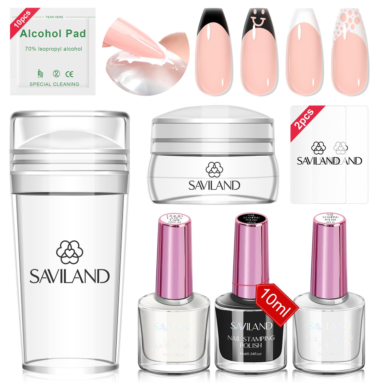 ? ?Best gift for important people? This nail stamper set is easy for both beginners and professional nail artists.It is an ideal gift for your wife, girlfriend and sister, especially on special occasions such as anniversary, Valentine's Day, Mother's Day, Christmas gifts and more.? ?French nails in high quality? By using a silicone nail stamp with special white and black gel nail polish in this French nails set, you can easily and easily carry out a French manicure at home.It enables you to achieve professional-looking results and create perfect, clear, classic and elegant French-nail art.? ?Perfect pattern diy transfer nail? With the nail stamp set from Saviland you can design your manicure with the nail stamp yourself.You can apply special gel nail polish to the nail art stamp and then transfer it to your nail to create a stylish manicure It is a perfect gel-liner nail art set!.? ?Over 1000 times used with silicone faults used for soft nails? This nail art nail stamp consists of crystalline pebble gel with a smooth surface that is reminiscent of a spongy material and is very easy to absorb compressed lacquer of stencils.The silicone nail stamp can roll to the brim nails and finish the outline of the plate, whether long or short nails.And it is really easy to clean with alcohol paeps.? ?Comprehensive nail art-tempered tool kits? Saviland 10-piece French nails stamp set with French tip contains 2 nail stamps, 2 interchangeable stamp heads, 2 bottles of special nail stamps gel nail polishes, 1 liquid offset latex band, 2 nail scraps and 30 alcohol pads isA perfect manicure tool for nail professionals and beginners.??BESTES GESCHENK FÜR WICHTIGE PERSONEN? Dieses Nail Stamper Set ist sowohl für Anfänger als auch für professionelle Nagelkünstler leicht zu verwenden. Es ist ein ideales Geschenk für Ihre Frau, Freundin und Schwester, insbesondere zu besonderen Anlässen wie Jahrestag, Valentinstag, Muttertag, Weihnachtsgeschenken und mehr. ??FRANZÖSISCHE NÄGEL IN HOCHWERTIGER QUALITÄT? Durch die Verwendung eines Silikon Nagelstempels mit speziellem weißen und schwarzen Gel-Nagellack in diesem French Nails Set können Sie ganz einfach und mühelos eine French-Maniküre zu Hause durchführen. Es ermöglicht Ihnen, professionell aussehende Ergebnisse zu erzielen und perfekte, klare, klassische und elegante French-Nail-Art zu schaffen. ??PERFEKTE MUSTER-DIY-TRANSFER-NAGEL? Mit dem Nagel Stempelset von Saviland können Sie Ihre Maniküre mit dem Nagel Stempel selbst gestalten. Sie können speziellen Gel-Nagellack auf den Nagelkunst-Stempel auftragen und ihn dann auf Ihren Nagel übertragen, um eine stilvolle Maniküre zu erstellen Es ist ein perfektes Gel-Liner-Nagelkunst-Set!. ??ÜBER 1000 MAL MIT SILIKONSTEMPERN FÜR WEICHE NÄGEL VERWENDET? Dieser Nailart Nagelstempel besteht aus kristallinem Kieselgel mit einer glatten Oberfläche, die an ein schwammiges Material erinnert und sich sehr leicht zum Aufnehmen von Drucklack von Schablonen eignet. Der Silikon Nail Stamp kann bis zum Rand gebogener Nägel rollen und den Umriss der Platte fertigstellen, egal ob lange oder kurze Nägel. Und es ist wirklich einfach mit Alkoholtupfern zu reinigen. ??UMFASSENDE NAIL-ART-STEMPER-WERKZEUGKITS?Saviland 10-teiliges French Nails Stempel Set mit französischer Spitze enthält 2 Nagelstempel, 2 austauschbare Stempelköpfe, 2 Flaschen speziellen Nagelstempel Gel Nagellacks, 1 flüssiges abziehbares Latexband, 2 Nagelschaber und 30 Alkohol Pads ist es ein perfektes Maniküre-Werkzeug für Nagelprofis und Anfänger.Saviland French Nails Stempel Kit – 10 teiliges French Nagel Stempel Kit mit 2 spezifischen Nagelstempel Gel Nagellacken, abziehbarem Latexband, Nagelschaber und austauschbarem Nagelstempelkopf