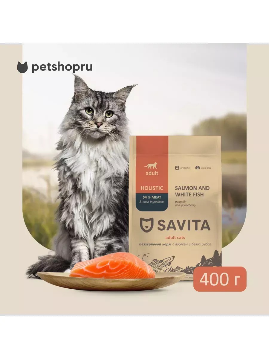 SAVITA Беззерновой корм для кошек с лососем и белой рыбой, 0,4 кг