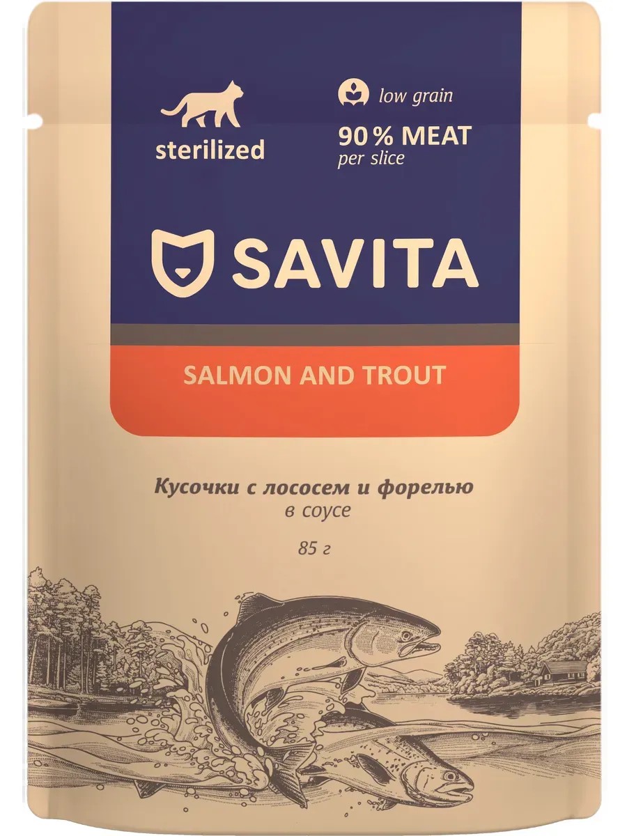 Savita Sterilized Salmon & Trout (in sauce) for sterilized cats, salmon and trout, 85 g. Savita meat pieces are natural diets with a high content of animal protein, natural antioxidants and healthy carbohydrates. Savita Sterilized pouches are created specifically for sterilized cats, taking into account their special needs. They contain L-carnitine for weight management and maintaining muscle tone, taurine for heart health and vision, and fiber for comfortable digestion. Special properties of Savita wet food: 90% meat in each piece; Human Grade raw material quality standard, low-grain formula, gluten-free, no soy, no artificial colors or GMOs, only natural ingredients. Ingredients: Meat and its derivatives 50% (including salmon and trout at least 20%), fish broth, fiber, rice, vitamins and minerals, Omega-3 and Omega-6 fatty acids, taurine, L-carnitine, lysine, methionine, cysteine, tryptophan. Nutritional value (100 g): proteins - 10.0 g, fats - 3.0 g, ash - 2 g, lysine-0.6 g, fiber - 0.5 g, methionine + cysteine-0.3 g, moisture - 80 g. Vitamins and minerals (100 g) not less than: vitamin A - 100 IU, vitamin D - 10 IU, vitamin E - 0.7 IU, iron - 5 mg, zinc -2 mg, copper - 0.19 mg, manganese - 0.25 mg, magnesium 0.018%. Energy value (per 100 g) not less than: 83 kcal / 347 kJ. Feeding Instructions Recommended Daily Feeding Instructions: 3 kg - 3 packs 3-6 kg - 4-5 packs 7-10 kg - 7.5-10 packs Transition from the previous diet gradually, in small portions over 5-7 days. When feeding, take into account the animal's activity and appetite. The food should be at room temperature. Store the contents of an opened package at +5°C and use within 2 days. The cat should always have access to fresh drinking water.