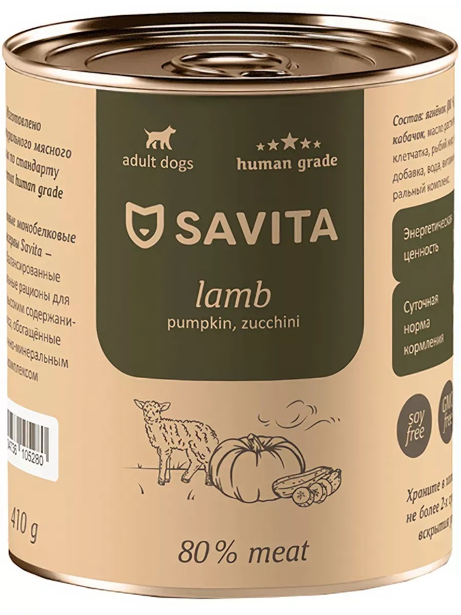 Savita Lamb, Pumpkin & Zucchini Canned Dog Food, Grain-Free, with Lamb, Pumpkin & Zucchini, 410 g, 6 pcs. Savita Lamb, Pumpkin & Zucchini Canned Dog Food, Grain-Free, with Lamb, Pumpkin & Zucchini, 410 g Savita — with respect for your pet’s wildlife. The benefits of natural ingredients and many years of experience, combined with the effectiveness of modern technology. Savita grain-free holistic canned food is a balanced natural diet for dogs with a high meat content, enriched with a vitamin and mineral complex. The single-protein composition is suitable for pets on an elimination diet and reduces the risk of allergic reactions. Advantages: Single-protein one source of animal protein. Made from natural raw materials according to human grade quality standards. Grain-free formula. No soy, GMOs, artificial preservatives or colors. Fiber for comfortable digestion. Omega-3 and -6 fatty acids for healthy skin and beautiful coat, strengthening the immune system. Ingredients: lamb (80%), pumpkin, zucchini, vegetable oil, fiber, fish oil, gelling agent, water. Nutritional value per 100 g of product: crude protein - 10.0 g; crude fat -9.0 g; crude ash 0.5 g, crude fiber 0.5 g, moisture 80%. Energy value per 100 g of product is 116 kcal. Additives per 1 kg of product: vitamin A 3000 IU, vitamin D3 200 IU, vitamin E 22 mg, vitamin C 40 mg, vitamin B1 12 mg, vitamin B2 6 mg, vitamin B6 3 mg, vitamin B12 75 mcg, niacinamide 15 mg, calcium d-pantothenate 9 mg, folic acid 0.35 mg, biotin 300 mcg, choline chloride 700 mg, zinc 25 mg, manganese 1.4 mg, iodine 0.75 mg, copper 1 mg. Daily intake is 60-80 g per 1 kg of animal weight. Storage conditions: at a temperature of 0 C to 25 C and a relative humidity of no more than 75%. It is recommended to use at room temperature. After opening the consumer packaging, store the product in the refrigerator for no more than 2 days. The shelf life is 2 years from the date of manufacture, provided the product is stored properly. The manufacturing date is indicated on the can.
