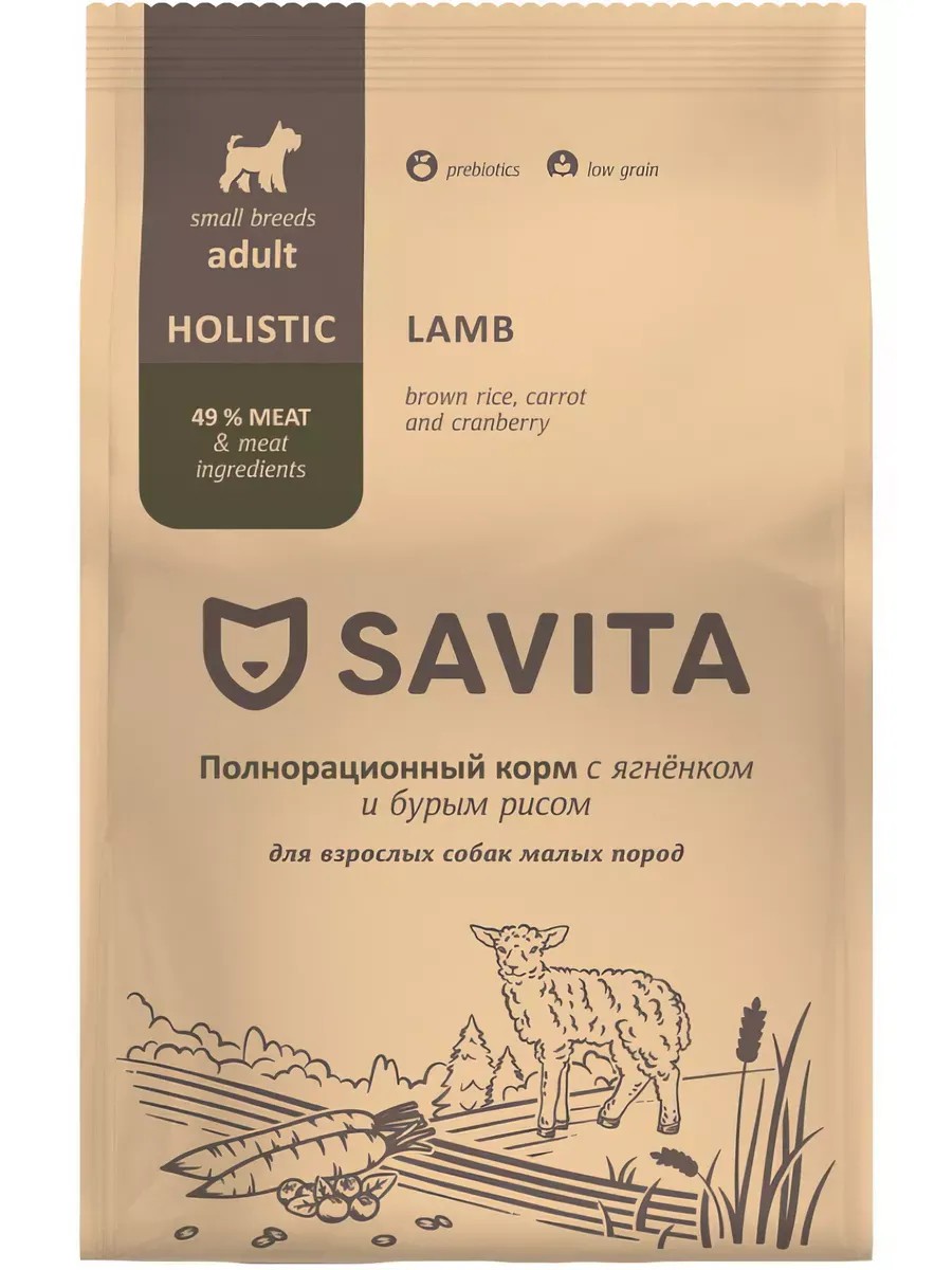 Savita dog food for small breeds, lamb with brown rice, 1.5 kg Savita respects the wild nature of your pet. The benefits of natural ingredients and many years of experience, combined with the effectiveness of modern technology. Complete and balanced Savita holistic food contains a high percentage of meat ingredients, essential vitamins and minerals. They provide the dog with the necessary energy for the whole day for a long time. Each ingredient is carefully selected in accordance with the natural needs of the pet and is an important component in the food recipe, minimizing the risk of allergic reactions. Advantages of the food: Balanced low-grain formula The food contains whole brown rice, which is a source of carbohydrates, fiber, B vitamins; Does not contain gluten; Does not contain chicken; High percentage of meat and meat ingredients; the food is made from natural raw materials according to the human grade quality standard, Does not contain GMOs, soy, flavors, artificial preservatives and colors; The dry food composition includes prebiotics necessary for healthy digestion of the pet; Vegetables, berries and herbs in the compositions are sources of antioxidants, vitamins and minerals. Granule size: 7 mm. Feeding recommendations: Ingredients: dehydrated turkey meat 28%, potatoes, whole brown rice, hydrolyzed lamb meat and liver 10%, poultry fat 11%, carrots, vitamin and mineral complex, beets, brewer's yeast (natural source of MOS), flax seeds, carob fruits, salmon oil (natural source of EPA and DHA), chicory root (natural source of FOS and inulin), alfalfa, pea fiber, cranberry, taurine, echinacea, rosemary and turmeric extract (complex of natural antioxidants), Yucca Schidigera, L-carnitine, glucosamine, chondroitin, antioxidant