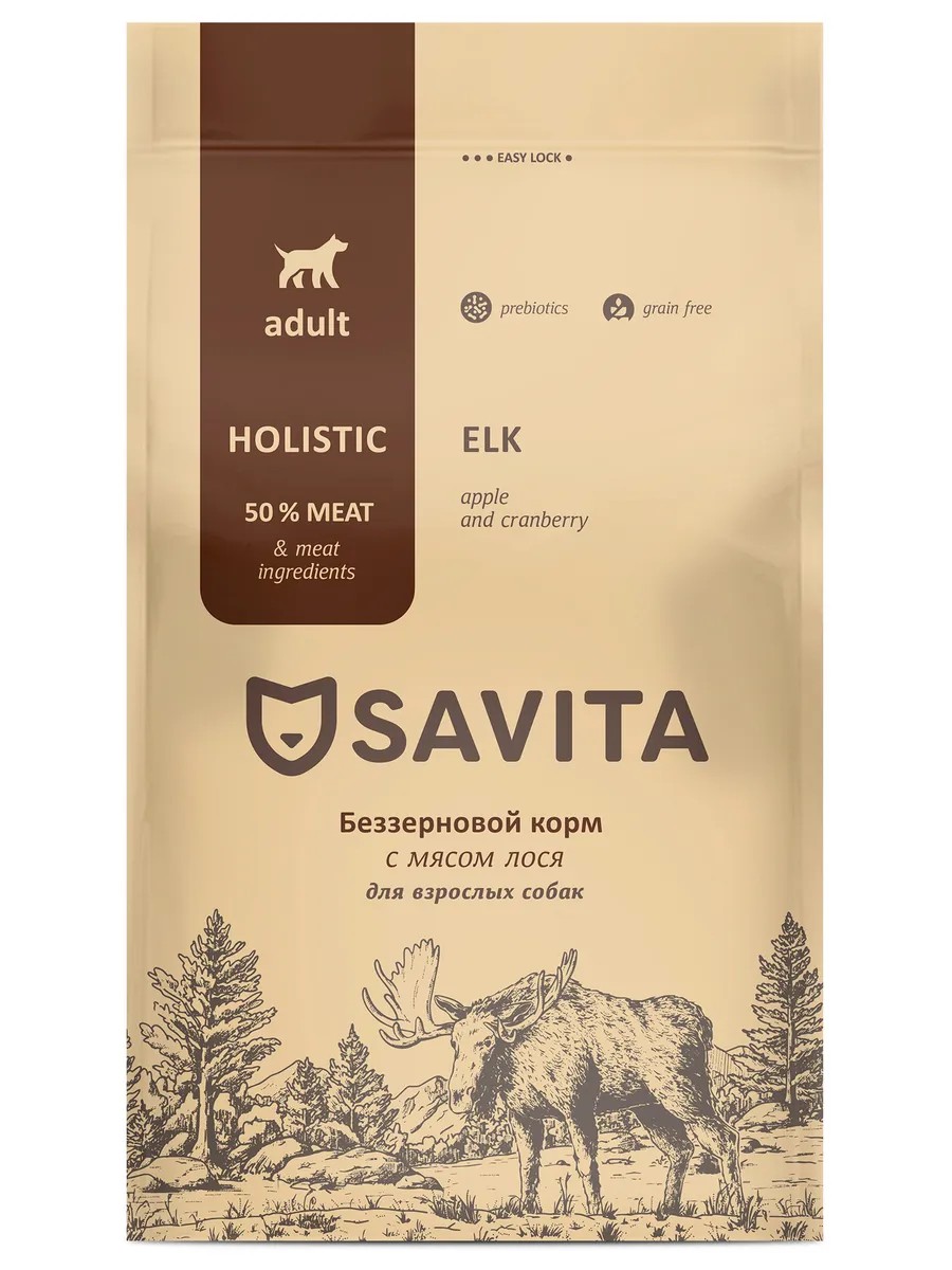 Корм Savita Holistiс Grain free (беззерновой) для собак, с мясом лося, 1 кг. Savita - с уважением к дикой природе Вашего питомца Польза природных ингредиентов и многолетний опыт, объединённые с эффективностью современных технологий. Полнорационные и сбалансированные корма Savita класса холистик содержат высокий процент мясных ингредиентов, необходимых витаминов и минералов, без добавления зерновых культур в составе. Надолго обеспечивают собаку необходимой энергией на весь день. Каждый ингредиент тщательно подобран в соответствии с природными потребностями питомца и является важным компонентом в рецептуре корма, минимизируя риск возникновения аллергических реакций. Преимущества корма: беззерновая формула; высокий процент мяса и мясных ингредиентов; корма изготовлены из натурального сырья по стандарту качества human grade, не содержат ГМО, сои, ароматизаторов, искусственных консервантов и красителей; составы сухих кормов включают пребиотики, необходимые для здорового пищеварения питомца; овощи, фрукты, ягоды и травы в составах являются источниками антиоксидантов, витаминов и минералов. Размер гранул: 11-13 мм. Суточная норма кормления в граммах в зависимости от дневной активности питомца: Состав: Мясо (в т. ч. телёнка 26%, лося 4%, оленя 4%), картофель, зелёный горошек, жир индейки (9%), гидролизованная свиная печень (7%), витаминно-минеральный комплекс, яблоко, пивные дрожжи, пульпа сахарной свёклы, цельное яйцо, морковь, тыква, льняное семя, лососёвый жир, цикорий, ламинария, клюква, розмарин, куркума, таурин, глюкозамин из животных тканей, сульфат хондроитина, юкка Шидигера, антиоксидант Аналитический состав: сырой белок 26%, сырой жир 15%, сырая клетчатка 3%, сырая зола 7%, кальций 1, 2%, фосфор 0, 9%, натрий 0, 3%, калий 0, 6%. Калорийность 383 кКал Питательные добавки на 1 кг: витамин А 16 000 МЕ, витамин D3 1500 МЕ, витамин E 300 мг, витамины группы В 2100 мг, витамин C 100 мг, медь (пентагидрат сульфата меди) 15 мг, цинк (сульфат цинка, моногидрат) 150 мг, марганец (моногидрат сульфата марганца) 25 мг, йод (йодат кальция, безводный) 3 мг, селен (селенит натрия) 0, 3 мг.