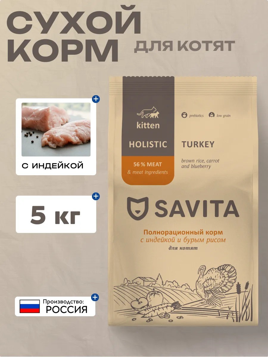 Features: Complete and balanced Savita holistic food for kittens contains a high percentage of meat and meat ingredients, as well as essential vitamins and minerals for a growing body. Ingredients: Meat: Turkey 34%, chickpeas, whole brown rice, poultry fat 12%, hydrolyzed turkey meat and liver 10%, potatoes, whole dried eggs, brewer's yeast (natural source of MOS), vitamin and mineral complex, beets, pea fiber, salmon oil (natural source of EPA and DHA), carrots, whey, flax seeds, chicory root (natural source of FOS and inulin), alfalfa, blueberries, psyllium, taurine, hemoglobin, rosemary and turmeric extract (complex of natural antioxidants), Yucca Schidigera, L-carnitine, glucosamine, chondroitin, antioxidant.