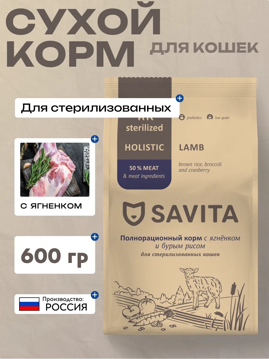SAVITA Сухой корм для стерилизованных кошек с ягненком 600 гр