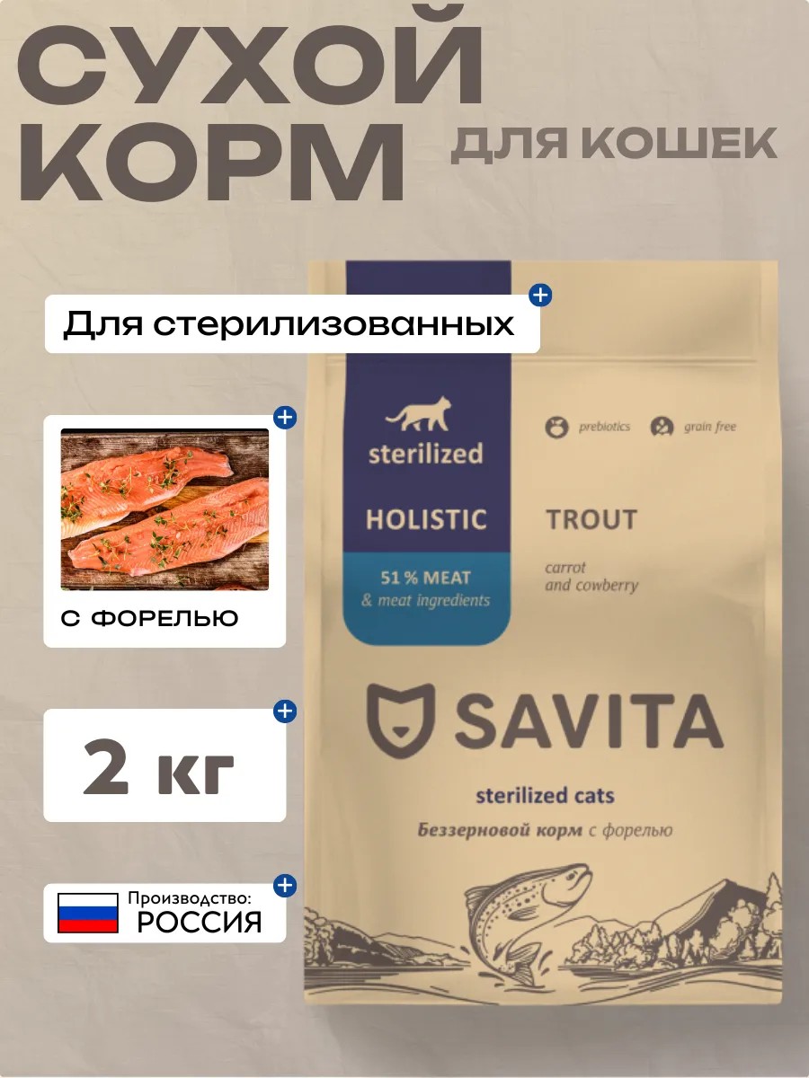 Особенности:Полнорационный и сбалансированный корм Savita класса холистик для взрослых кошек содержит комплекс витаминов и минералов, необходимый животному после произошедших изменений в организме.Состав:Мясо:Рыба океанических пород 27 %(в т.ч. форель 10 %)Индейка 12 %Картофель, зелёный горошек, жир индейки (6%), гидролизованная печень индейки (6%), витаминно-минеральный комплекс, пивные дрожжи, цельное яйцо, пульпа сахарной свёклы, льняное семя, растительная клетчатка, тыква, морковь, лососёвый жир, брусника, L-карнитин, ромашка, розмарин, цикорий, таурин, глюкозамин из животных тканей, сульфат хондроитина, юкка Шидигера, антиокидант.Размер гранулГранулы среднего размера отлично подходят для взрослых кошек. Разгрызание корма препятствует образованию зубного камня и массирует дёсны.7,5–8,5 ммАналитический состав:Cырой жирСырой белокСырая золаСырая клетчатка,Ca 1,2% Ph 0,8%Na 0,3% К 0,6%33%12%8%3%Питательные добавки на 1 кгВитамин A 20000 МЕ, витамин D3 1600 МЕ, витамин E 400 мг, витамины группы В 2900 мг, витамин C 100 мг, таурин 16000 мг, медь (сульфат меди пентагидрат) 15 мг, цинк (сульфат цинка моногидрат) 140 мг, марганец (сульфат марганца моногидрат) 30 мг, йод (йодат кальция) 2 мг, селен (селенит натрия) 0,4 мг.