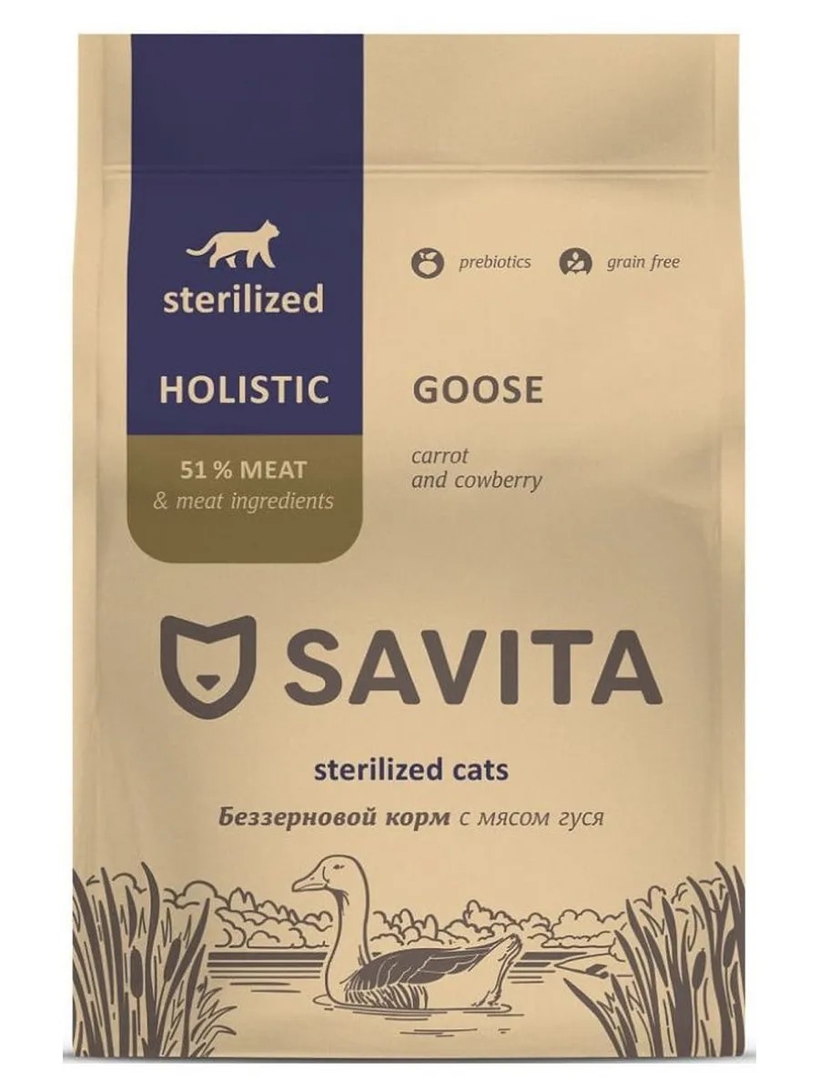 Полнорационный и сбалансированный корм Savita класса холистик для взрослых кошек содержит комплекс витаминов и минералов, необходимый животному после произошедших изменений в организме,без добавления зерновых культур в составе. Надолго обеспечивают кошку необходимой энергией на весь день Каждый ингредиент тщательно подобран в соответствии с природными потребностями питомца и является важным компонентом в рецептуре корма, минимизируя риск возникновения аллергических реакций. Преимущества корма: • Беззерновая формула. • Гипоаллергенное мясо гуся и индейки в составе - источники качественных белков и жиров. • Высокий процент мяса и мясных ингредиентов. • Корма изготовлены из натурального сырья по стандарту качества human grade. • Не содержат ГМО, сои, ароматизаторов, искусственных консервантов и красителей. • Составы сухих кормов включают пребиотики, необходимые для здорового пищеварения питомца. • Овощи, ягоды и травы в составах являются источниками антиоксидантов, витаминов и минералов. • Размер гранул: 7,5-8,5 мм. • Гранулы среднего размера отлично подходят для взрослых кошек. • Разгрызание корма препятствует образованию зубного камня и массирует дёсны.