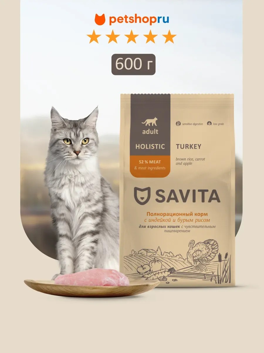 SAVITA Корм для кошек с чувствит. пищеварением с индейкой, 0,6кг