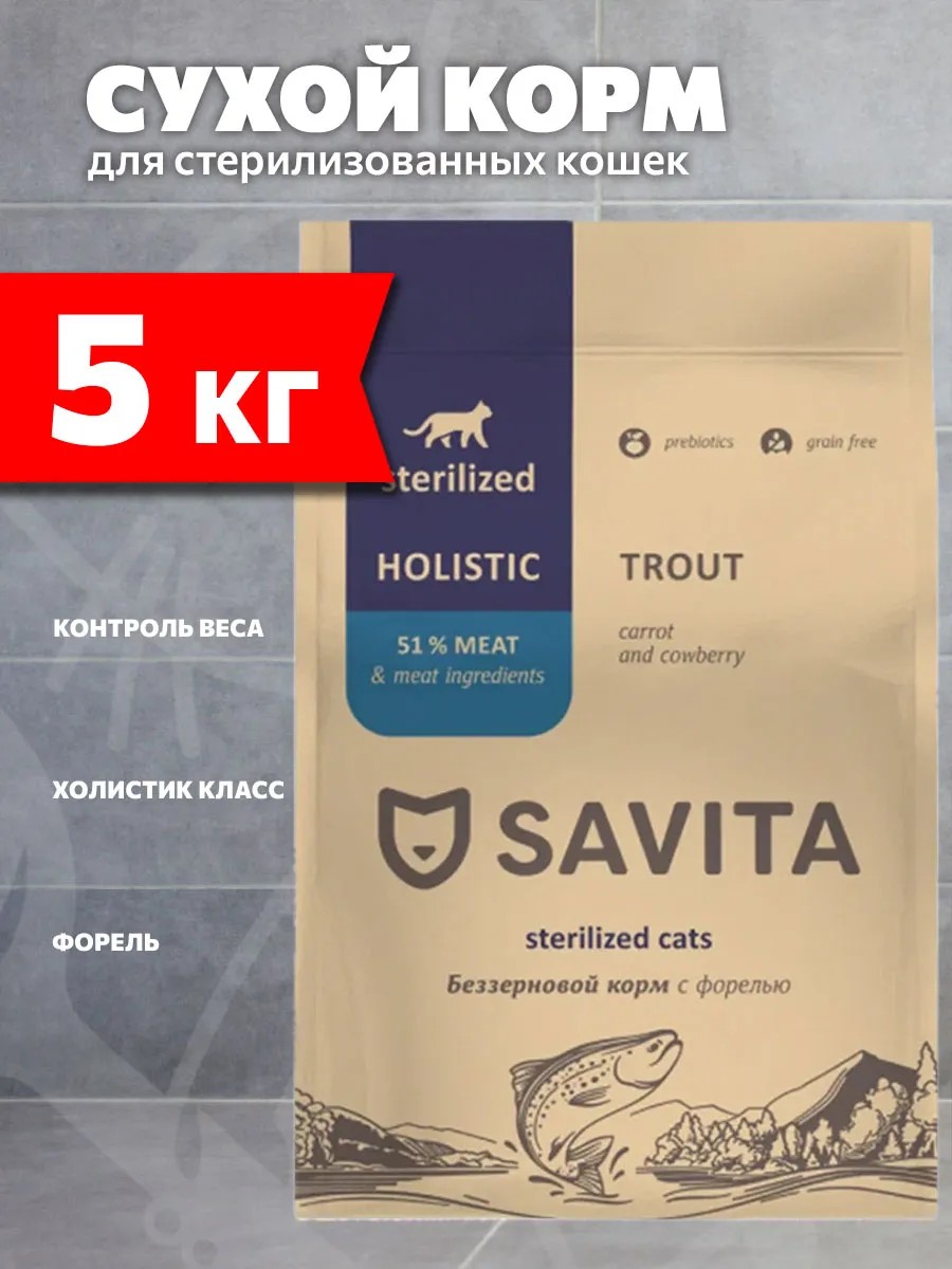 SAVITA Корм для стерилизованных кошек беззерновой форель 5 кг