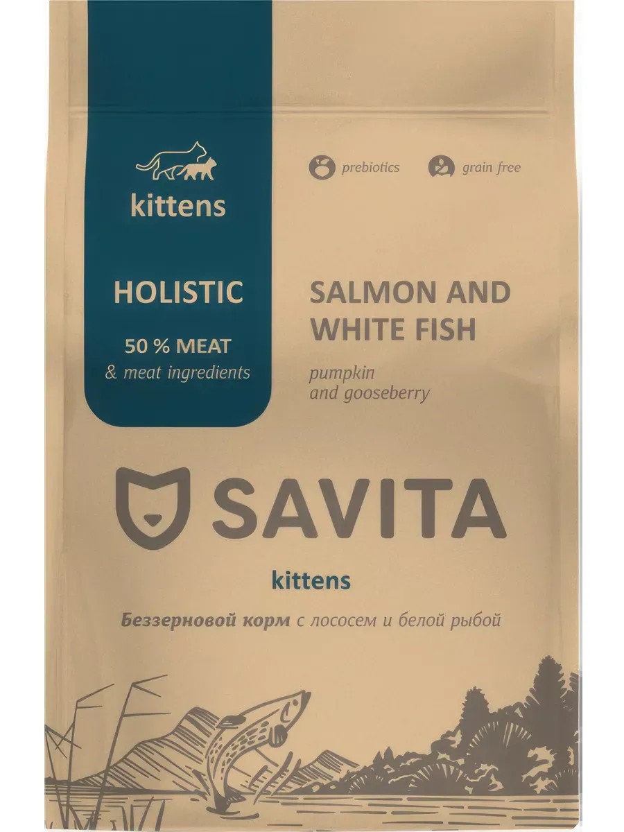 Корм Savita Kittens Holistic Salmon & White Fish для котят, беззерновой, с пребиотиками, лосось и белая рыба, 400 г. Корм Savita Kittens Holistic Salmon & White Fish для котят, беззерновой, с пребиотиками, лосось и белая рыба, 400 г. Savita - с уважением к дикой природе Вашего питомца.Польза природных ингредиентов и многолетний опыт, объединённые с эффективностью современных технологий.Полнорационные и сбалансированные корма Savita класса холистик содержат высокий процент мясных ингредиентов, необходимых витаминов и минералов, без добавления зерновых культур в составе. Надолго обеспечивают котенка необходимой энергией для правильного роста и развития. Каждый ингредиент тщательно подобран в соответствии с природными потребностями питомца и является важным компонентом в рецептуре корма, минимизируя риск возникновения аллергических реакций.Преимущества корма:беззерновая формула;высокий процент мяса и мясных ингредиентов;корма изготовлены из натурального сырья по стандарту качества human grade,не содержат ГМО, сои, ароматизаторов, искусственных консервантов и красителей;составы сухих кормов включают пребиотики, необходимые для здорового пищеварения питомца;овощи, фрукты, ягоды и травы в составах являются источниками антиоксидантов, витаминов и минералов.Размер гранул: 4,5-5ммСостав: рыба (в т.ч. треска 30 %, лосось 8 %), картофель, зелёный горошек, куриный жир, витаминно-минеральный комплекс, пивные дрожжи,цельное яйцо, пульпа сахарной свёклы, льняное семя, тыква, морковь, яблоко, лососёвый жир, облепиха, крыжовник, розмарин, цикорий, таурин, глюкозамин из животных тканей, сульфат хондроитина, юкка Шидигера.Аналитический состав: сырой белок 35%, сырой жир 18%, сырая клетчатка 2,5%, сырая зола 8%, кальций 1,5%, фосфор 1,1%, натрий 0,4%, калий 0,6% Калорийность 422 кКал Питательные добавки на 1 кг: витамин A 20 000 МЕ, витамин D3 1 600 МЕ, витамин E 400 мг, витамины группы В 2900 мг, витамин C 100 мг, таурин 16000 мг, медь (сульфат меди пентагидрат) 15 мг, цинк (сульфат цинка моногидрат) 140 мг, марганец (сульфат марганца моногидрат) 30 мг, йод (йодат кальция) 2 мг, селен (селенит натрия) 0,4 мг Технологические добавки: антиоксидант.Рекомендации по кормлению:Возраст, мес. Вес, кгСут.норма, г1-30,4 - 224 - 754-91-335 - 7510-122-456 - 90