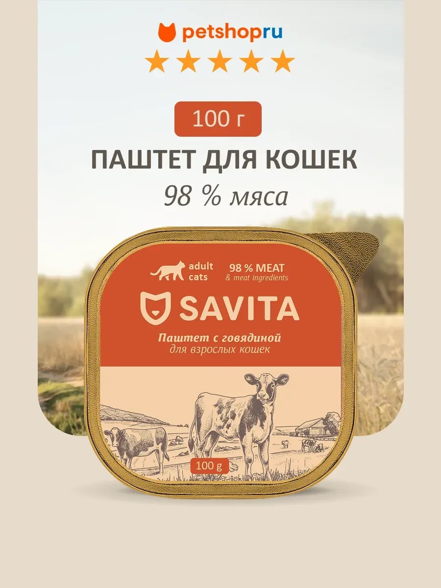 SAVITA Паштет для кошек со свежей говядиной,98% мяса, 100 г