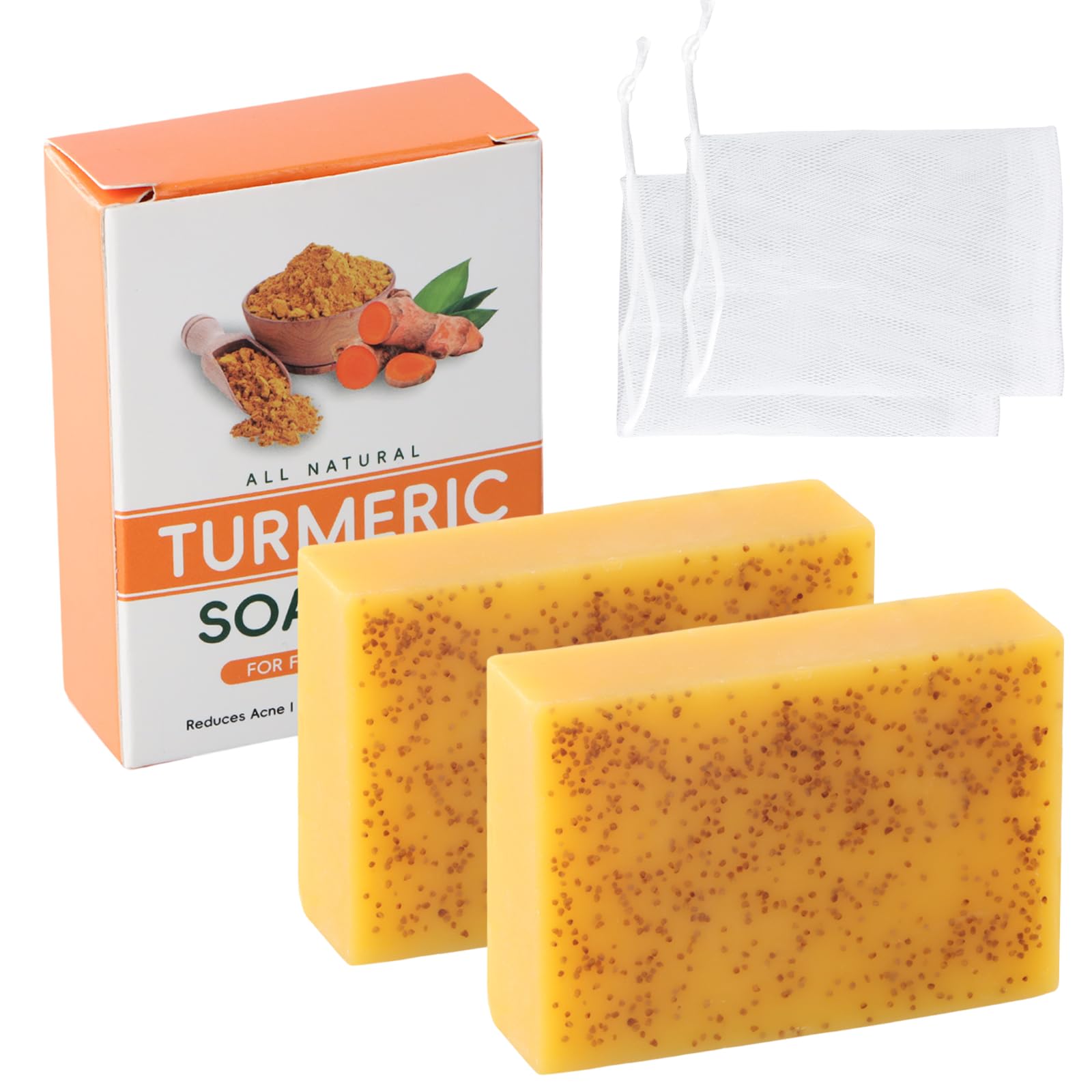 Savon à L'acide Kojique au Curcuma, Naturel Savon Curcuma Eclaircissant avec un Filet Moussant, Turmeric Soap Fait à la Main, Barre Savon Exfoliante au Curcuma pour Visage et Corp (2x100g)