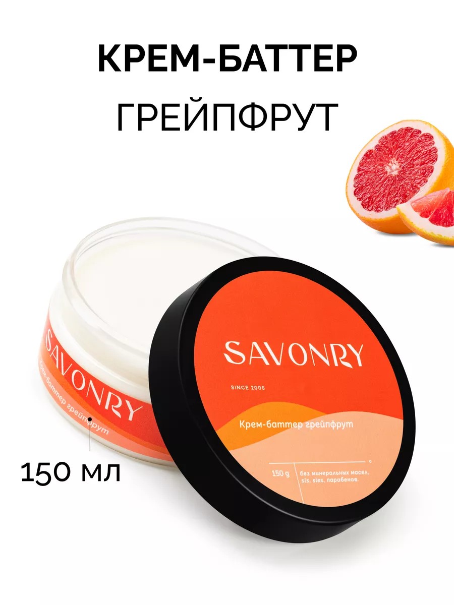 Крем баттер Грейпфрут от Савонри это интенсивный уход за кожей, особенно за сухой и трескающейся. Баттер масло питает и смягчает кожу, способствуя ее регенерации и заживлению. Жирный крем для тела имеет плотную текстуру. В составе ценные масла для тела - масло ши, жожоба и какао. Масло какао богато витамином F, В, жирными кислотами, которые способствуют удержанию влаги в клетках кожи, предотвращают появление морщин, растяжек, устраняют небольшие косметические дефекты, обладают заживляющим действием, предохраняют кожу от повреждений в зимнее время, подтягивают кожу всего тела и придают ей упругий здоровый вид в летнее. Масло грейпфрута насыщено витамином С, что помогает регулировать жировой обмен, дезинфицирует кожу, укрепит иммунную систему. Баттер многофункционален в применении: отлично подойдет для массажа всего тела, как маска восковая маска для рук, ног и пяток от трещин и мозолей. Наносить на грубую, очень сухую кожу - локти, колени, пятки. Крем баттер для тела от сухости и трещин для очень сухой кожи, отличный подарок для близких.