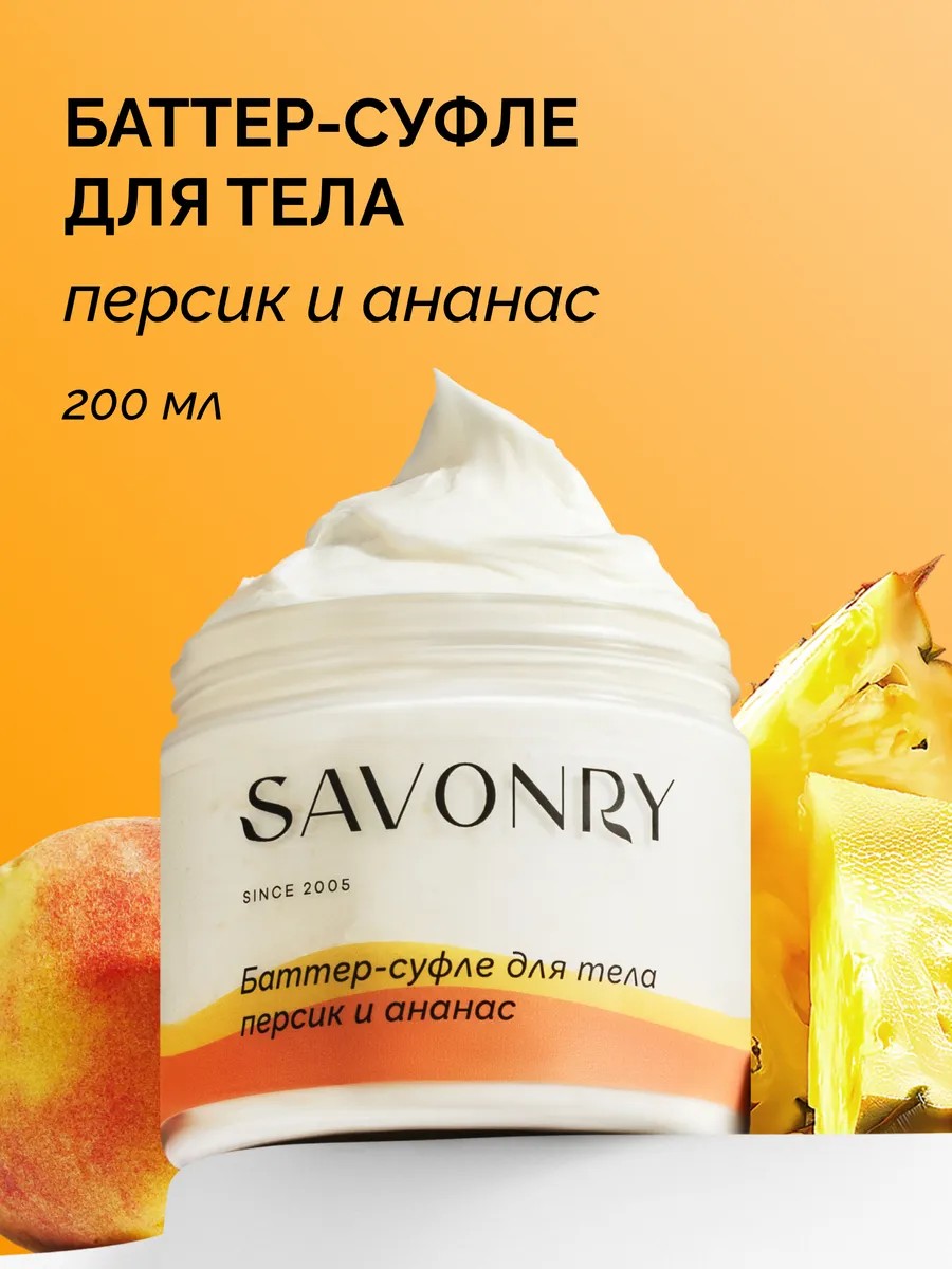 Баттер-суфле на основе масла ши и персика — это уникальное средство для ухода за кожей, которое подарит вам ощущение комфорта и нежности. Воздушная текстура взбитого масла легко распределяется по коже, обеспечивая мгновенное увлажнение и питание, масло тающее от тепла рук отлично подойдет для массажа. Масла ши и персика эффективно смягчают, успокаивают кожу придавая ей здоровый вид, подойдет как масло для массажа. Экстракт ананаса насыщает витаминами, обеспечивая дополнительное увлажнение. Витамин Е, известный своими антиоксидантными свойствами, помогает замедлить процессы старения и защищает кожу от негативного воздействия внешней среды. Средство идеально подходит для сухой и чувствительной кожи, огрубевших участков кожи.