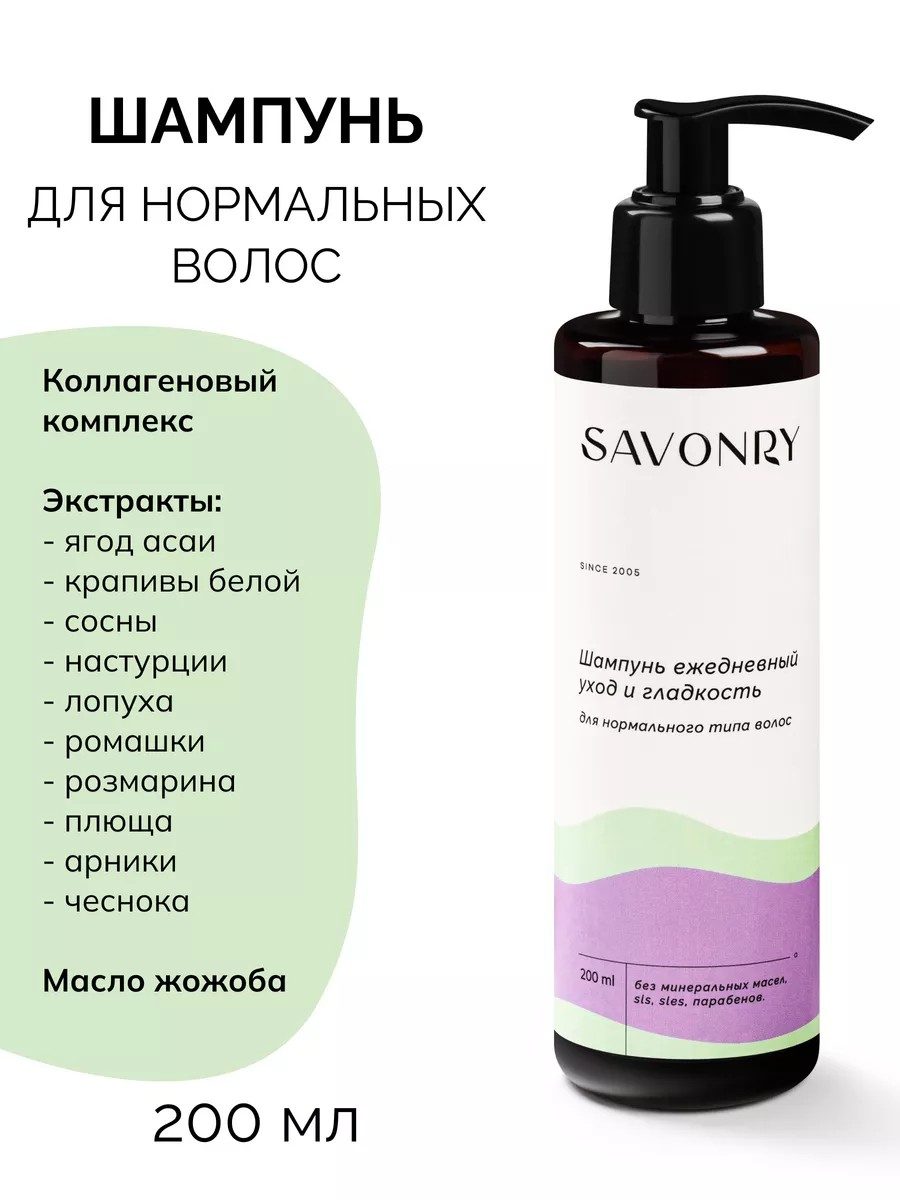 Савонри шампунь с дозатором для нормальных волос с только растительными компонентами - смесью соков и маслом авокадо. Шампунь с коллагеном Ежедневный уход и гладкость подходит для тщательного очищения и ухода за нормальным типом волос. Гидролат лаванды, коллагеновый комплекс и масло жожоба увлажняют и укрепляют структуру волоса, делая их более мягкими и эластичными. Д-пантенол, также известный как провитамин B5, питает, придает волосам гладкость и делает их послушными. Комплекс экстрактов ягод асаи, крапивы белой, сосны, настурции, лопуха, ромашки, розмарина, плюща, арники, чеснока обогащает шампунь полезными микроэлементами и витаминами, которые способствуют укреплению волос и защите их от негативных факторов окружающей среды.