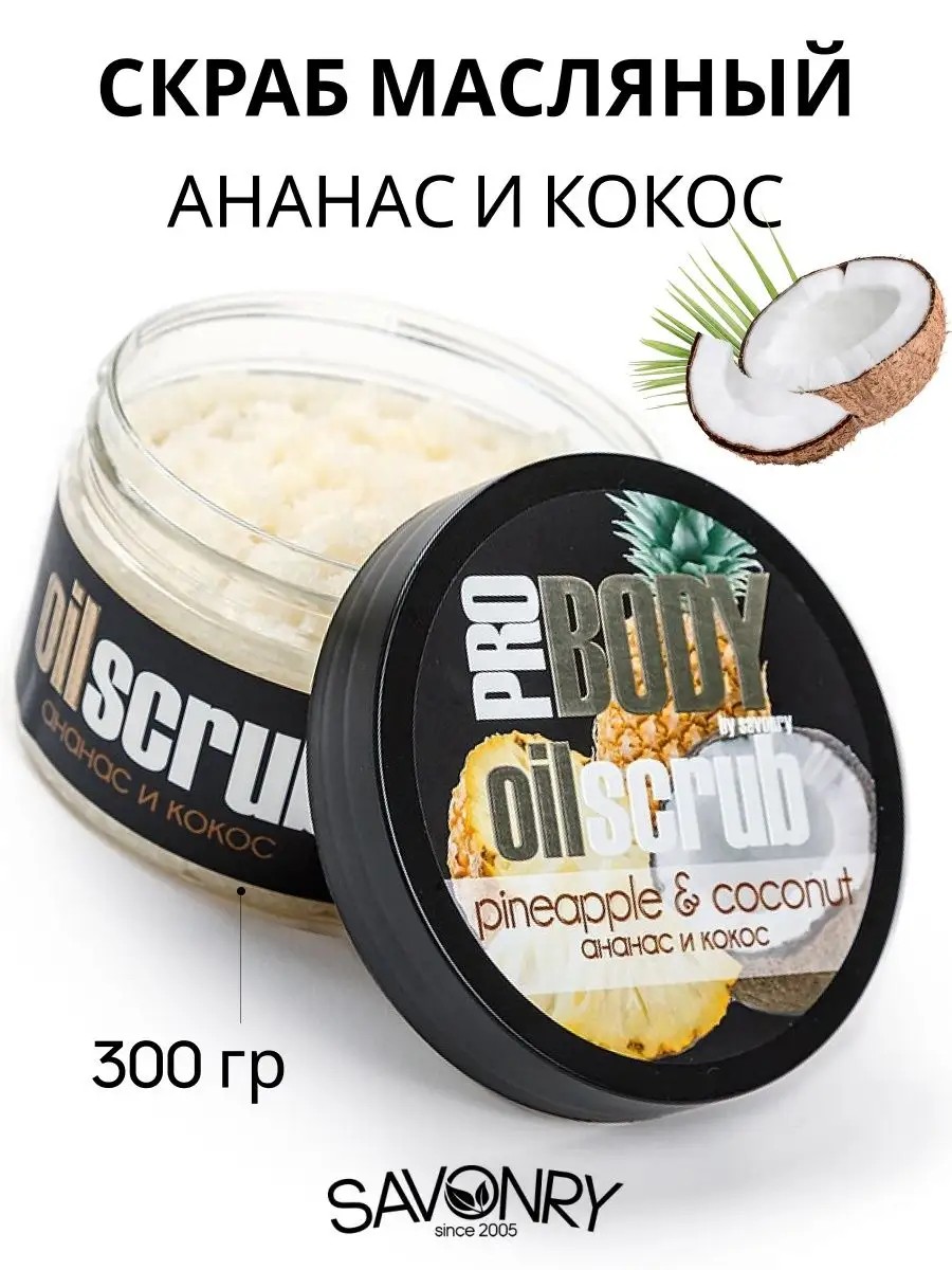 Серия сахарных скрабов для тела с маслами - это настоящий десерт для кожи! Скрабы с натуральным составом - некрупный сахар, растительные масла кокоса, сладкого миндаля, масло авокадо,кунжутное масло, ши, натуральный пчелиный воск, плоды ягод и фруктов. Вегетарианская косметика, насыщенная витаминами и микроэлементами, без парабенов, без SLS, без силиконов, подходит для всех типов кожи. Скрабы Савонри для тела - деликатно отшелушивают, бережно очищают кожу от ороговевших клеток, увлажняют, тонизируют, интенсивно питают кожу, стимулируют процессы регенерации кожи, делают кожу мягкой, бархатистой. Скраб антицеллюлитный с Ананасом и Кокосом подходит для регулярного ухода за кожей для домашних и салонных спа-процедур, ванн, душа.