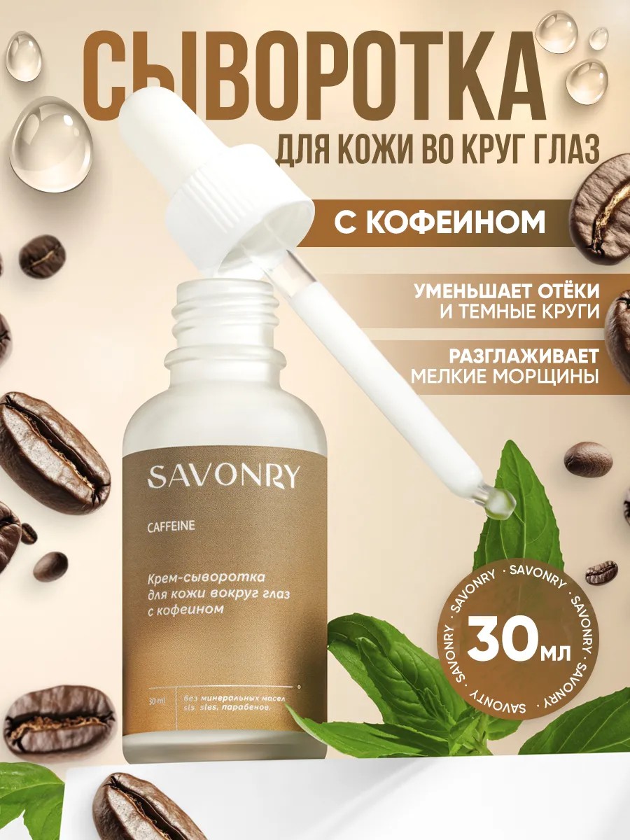 Сыворотка для кожи вокруг глаз Savonry с кофеином – это инновационное средство, которое станет незаменимой частью вашего ежедневного ухода за кожей. Эта косметика разработана специально для борьбы с отеками, темными кругами и морщинами, которые часто появляются в области глаз. Благодаря тщательно подобранным компонентам, сыворотка эффективно справляется с этими проблемами, возвращая коже свежесть и молодость. Основным активным ингредиентом сыворотки является кофеин, известный своими тонизирующими и стимулирующими свойствами. Он способствует улучшению микроциркуляции, что помогает уменьшить отеки и синяки под глазами. В сочетании с экстрактом зеленого кофе, кофеин активизирует обменные процессы в коже, что делает её более упругой и сияющей. Этот тандем компонентов обеспечивает мощный антивозрастной эффект, помогая разгладить мелкие морщины и предотвращая появление новых. Сыворотка представлена в удобном стеклянном флаконе с пипеткой. Легкая текстура крема быстро впитывается, не оставляя липкой пленки, что делает его идеальным для использования перед нанесением макияжа. Вы можете применять сыворотку как несмываемые жидкие патчи, что особенно удобно в утренние часы, когда необходимо быстро привести кожу в тонус. Подходит для всех типов кожи, однако, если у вас чувствительная кожа, рекомендуется протестировать средство на небольшом участке, чтобы убедиться в отсутствии аллергической реакции на компоненты. Для достижения максимального эффекта охлаждения и тонизирования, храните сыворотку в холодильнике. Эта сыворотка – идеальный выбор для тех, кто ищет эффективное средство для ухода за кожей вокруг глаз. Она не только улучшает внешний вид кожи, но и заботится о её здоровье, обеспечивая комплексный антивозрастной уход. Включите её в свой ежедневный ритуал красоты, и вы заметите, как ваша кожа становится более гладкой, упругой и сияющей. Сыворотка для кожи вокруг глаз с кофеином – это ваш надежный помощник в борьбе за молодость и красоту кожи.