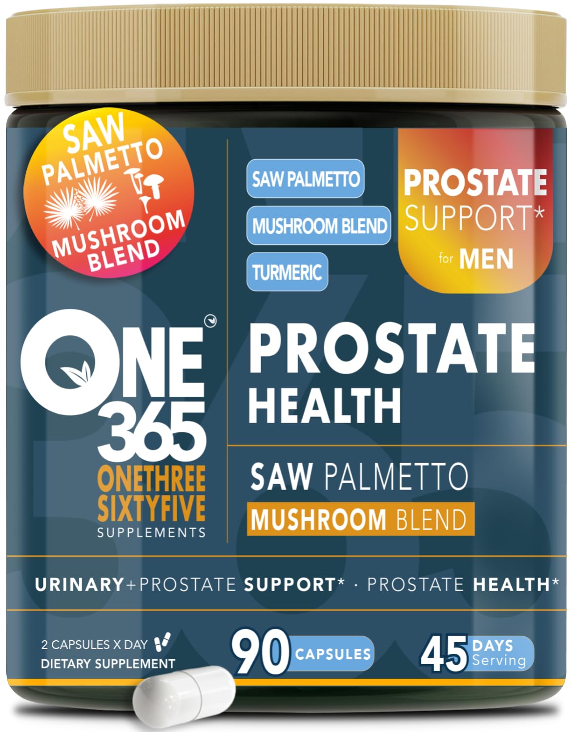 Each bottle contains 90 capsules, a full 45-day supply (2 capsules day). Our formula combines well-known prostate-support ingredients such as Saw Palmetto Extract (45 fatty acids), Beta-Sitosterol and Plant Sterols, Stinging Nettle Root, a Maitake Reishi Mushroom Blend, Turmeric (95 curcuminoids), Green Tea Extract (polyphenols EGCG), and natural Lycopene from tomatoes. It also includes essential vitamins and minerals for men's health: Zinc, Selenium, Magnesium, Copper, and Vitamin C.