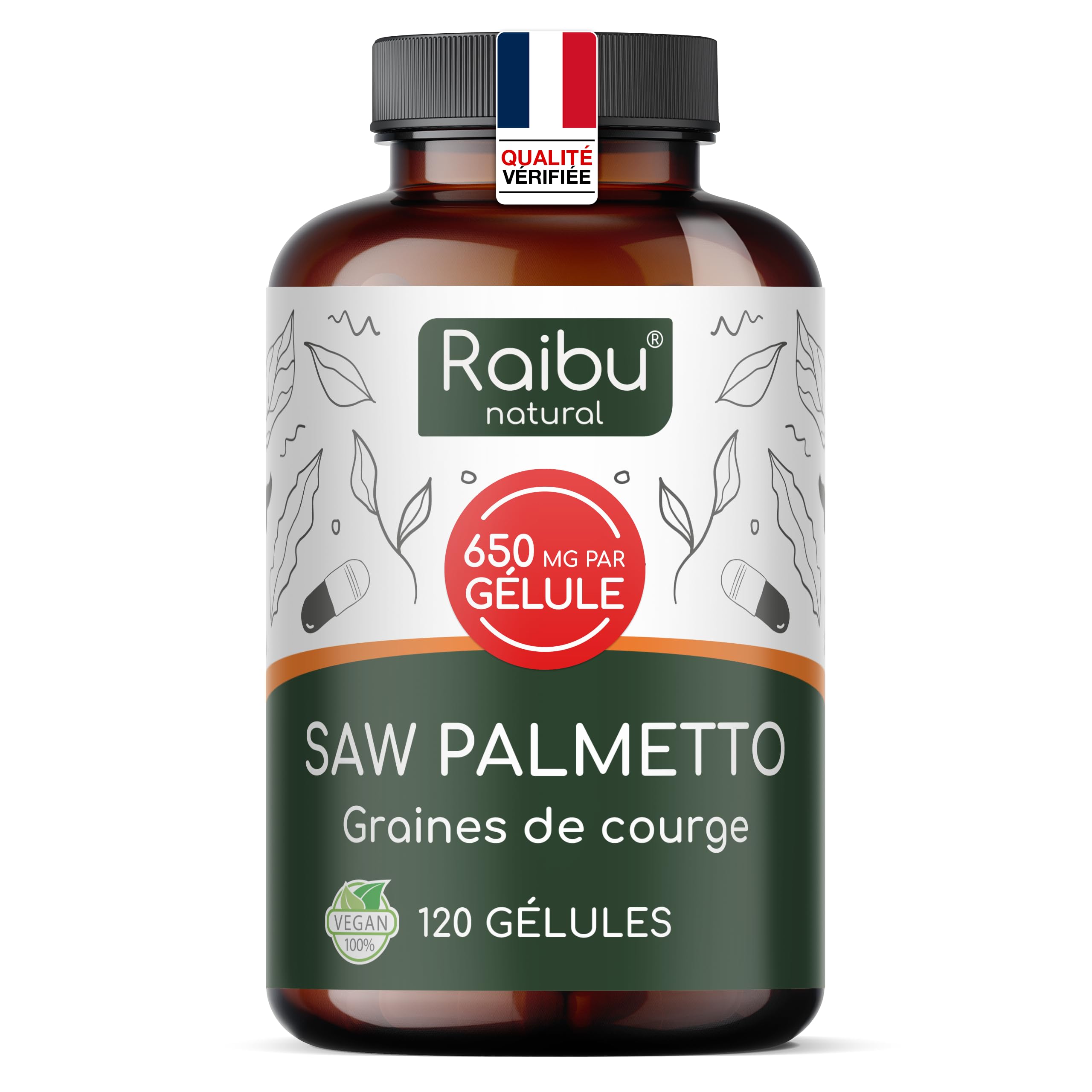 MANUFACTURED TO EUROPEAN STANDARDS: Each batch is produced according to strict European standards and undergoes rigorous quality control. Our product is lab-tested to ensure its purity and safety, guaranteeing reliable supplementation. VEGAN AND ADDITIVE-FREE FORMULA: Our Raibu saw palmetto capsules are vegan and free of artificial additives, developed with a focus on purity and quality to seamlessly integrate into your daily routine. STANDARDIZED TO 5 PHYTOSTEROLS: Each capsule contains 27.5mg of phytosterols – an important indicator of the natural quality of saw palmetto extract. WITH PUMPKIN SEED EXTRACT – COMPLETE FORMULA: Our formula combines saw palmetto with 100mg of pumpkin seed extract per capsule – a popular duo, selected for their complementary benefits. Easy to incorporate into your routine, with no unnecessary mixing. NATURAL PROSTATE SUPPORT: Saw Palmetto (Serenoa repens, or dwarf palm) is a plant traditionally used to support normal prostate function and urinary comfort as part of a holistic approach to men's wellness. Our Saw Palmetto formula provides 550 mg of a 20:1 extract per softgel, equivalent to 11,000 mg of dried plant. Natural support for daily use.FABRICATION SELON LES NORMES EUROPÉENNES: Chaque lot est produit selon des normes européennes strictes et soumis à des contrôles de qualité rigoureux. Notre produit est testé en laboratoire pour attester sa pureté et sa sécurité, vous assurant ainsi une supplémentation fiable. FORMULE VÉGANE ET SANS ADDITIFS: Nos gélules de palmier nain Raibu sont véganes et exemptes d'additifs artificiels, développées avec un souci de pureté et de qualité pour s'intégrer parfaitement dans votre routine quotidienne. STANDARDISÉ À 5 DE PHYTOSTÉROLS: Chaque gélule contient 27,5mg de phytostérols – un indicateur important de la qualité naturelle de l'extrait de palmier nain. AVEC EXTRAIT DE GRAINES DE COURGE - FORMULE COMPLÈTE: Notre formule associe le saw palmetto à 100mg d'extrait de graines de courge par gélule - un duo apprécié, sélectionné pour sa complémentarité. Facile à intégrer dans votre routine, sans mélanges inutiles. SOUTIEN NATUREL DE LA PROSTATE: Le Saw Palmetto (Serenoa repens ou palmier nain) est une plante traditionnellement utilisée pour soutenir la fonction normale de la prostate et le confort urinaire, dans le cadre d'une approche globale du bien-être masculin. Notre formule au Saw Palmetto apporte 550 mg d'un extrait 20:1 par gélule, soit l'équivalent de 11 000 mg de plante sèche. Un soutien naturel pour un usage quotidien.Saw Palmetto - Haute Teneur: 11000 mg de Palmier Nain par Gélule (20:1), avec Graines de Courge - 120 Gélules de Palmier Nain pour 4 Mois d'Utilisation - Végan Sans Additifs - Raibu