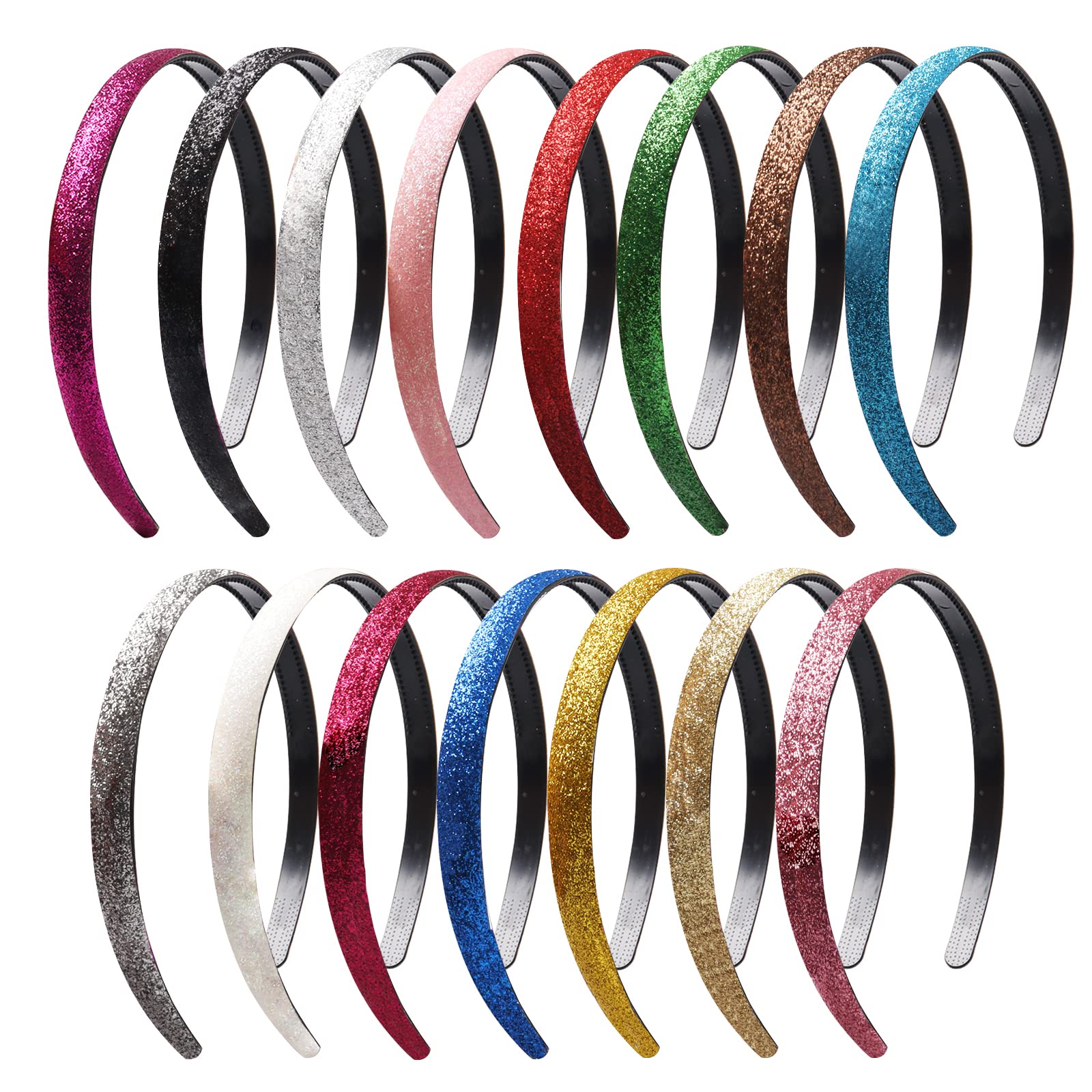 Glitter hair bands have 15 colors:red, green, dark blue, rose, black, gold, silver, fuchsia, light blue, white, gray, pink, brown, yellow, light pink.