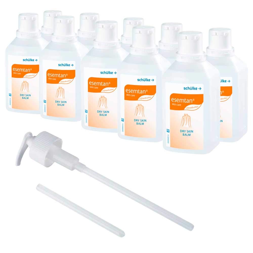 The student skincare kit includes 10 x 500ml tubes of Esemtan Dry Skin Balm and a convenient pump dispenser for easy application. The balm is dye-free and suitable for demanding and dry skin. Kit Contents: Pack of 10 x 500ml Esemtan Dry Skin Balms 1 student pump dispenser Balm Properties: Rich formula Intensely moisturizes the skin Easy to apply Dye-free with a pleasant fragrance Dermatologically tested Water-based formula Contains shea butter, which restores skin's suppleness and regulates moisture levels Contains vitamin E, which absorbs moisture, regenerates cells, and promotes blood circulation. Ingredients: Aqua, Paraffinum Liquidum, Caprylic Capric Triglyceride, Glycerin, Polyglyceryl-2 Dipolyhydroxystearate, Polyglyceryl-3 Diisostearate, Butyrospermum Parkii Butter, Zinc Stearate, Magnesium Sulfate, Tocopherol, Parfum, Potassium Sorbate, Sodium Benzoate, Citric Acid. Areas of application for the balm For the care of dry and demanding skin. Suitable for hand and body care. INGREDIENTS Aqua, Paraffinum Liquidum, Caprylic Capric Triglyceride, Glycerin, Polyglyceryl-2 Dipolyhydroxystearate, Polyglyceryl-3 Diisostearate, Butyrospermum Parkii, Zinc Stearate, Magnesium Sulfate, Tocopherol, Parfum, Potassium Sorbate, Sodium Benzoate, Citric AcidSuitable for the care of dry and demanding skin – suitable for hand and body care. Dye-free and pleasantly fragranced, dermatologically tested. Rich, evenly distributed, oil-in-water formula. Esemtan Dry Skin Cleansing Lotion, 10 x 500ml bottles. Schülke Skin Care Kit 1 pump dispenser for schoolchildren.Schüke Esemtan Dry Skin Balm Lot de 10 baumes de soin pour la peau 500 ml Sans colorant 1 pompe doseuseDESCRIPTION DU PRODUIT DESCRIPTION DU PRODUIT Le kit de soins de la peau pour étudiants comprend 10 x 500 ml de baume Esemtan Dry Skin Balm et une pompe doseuse adaptée pour faciliter le retrait du produit. Le baume de soin est sans colorant et peut être utilisé pour les peaux exigeantes et sèches. Contenu du kit de soins de la peau. Lot de 10 baumes secs Esemtan de 500 ml. 1 pompe doseuse pour écolier. Propriétés du baume de soin Soin riche Hydrate intensément la peau. Facile à répartir. Sans colorant et parfum agréable. Testé dermatologiquement. Base aqueuse dans l'huile. Contient du beurre de karité, qui redonne à la peau sa souplesse et régule l'hydratation de la peau. Contient de la vitamine E, qui absorbe l'humidité, régénère les cellules et favorise la circulation sanguine. Composition : Aqua, Paraffinum Liquidum, Caprylic Capric Triglyceride, Glycerin, Polyglyceryl-2 Dipolyhydroxystearate, Polyglyceryl-3 Diisostearate, Butyrospermum Parkii Butter, Zinc Stearate, Magnesium Sulfate, Tocopherol, Parfum, Potassium Sorbate, Sodium Benzoate, Citric Acicide. D Domaines d'application du baume de soin Pour le soin des peaux sèches et exigeantes. Convient pour les soins des mains et du corps. INGRÉDIENTS Aqua, Paraffinum Liquidum, Caprylic Capric Triglyceride, Glycerin, Polyglyceryl-2 Dipolyhydroxystearate, Polyglyceryl-3 Diisostearate, Butyrospermum Parkii, Zinc Stearate, Magnesium Sulfate, Tocopherol, Parfum, Potassium Sorbate, Sodium Benzoate, Citric AcidConvient pour le soin des peaux sèches et exigeantes - Convient pour les soins des mains et du corps. Sans colorant et parfum agréable, testé dermatologiquement. Soin riche, bien réparti, base d'huile dans l'eau. Esemtan Dry Skin Blam Lot de 10 flacons de 500 ml. Schülke Kit de soins de la peau 1 pompe doseuse pour écolier.