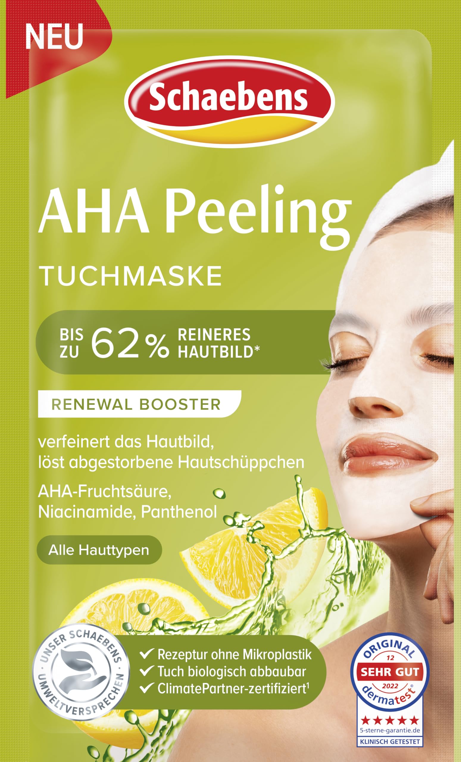 Schaebens AHA Renewal Booster Exfoliating Mask: for a radiant complexion. In this effective formula, AHA combines fruit acid, niacinamide, and panthenol. The AHA fruit acid promotes the skin's natural renewal and gently removes dead skin cells. The gentle chemical exfoliation effect unclogs pores, refines skin texture, and ensures a radiant glow. Skin irregularities are smoothed, and the skin texture is more even and intensely nourished. For an even complexion. INGREDIENTS Aqua, Pentylene Glycol, Acer Saccharum Extract, Allantoin, Citrus Limon Peel Oil, Glucose, Glycolic Acid, Niacinamide, Panthenol, Sodium Ascorbyl Phosphate, Sodium Hyaluronate, Tartaric Acid, Citric Acid, Lactic Acid, Parfum, Sodium Hydroxide, Xanthan Gum. INSTRUCTIONS FOR USE Sit back, relax, and look your best. Apply 2 to 3 times per week. 1. Apply the sheet mask to your cleansed face and mold it to the contours of your face. 2. Leave on for 5-10 (maximum 10) minutes and remove the mask. 3. Rinse off any remaining mask with lukewarm water. Tip: For an extra refreshing boost, store the sheet mask in the refrigerator. SAFETY WARNING For external use only. See moreAbout Schaebens: As Germany's best-selling facial care brand, Schaebens has a significant responsibility and strives to be a leader in sustainability. Schaebens is committed to making its business practices as environmentally friendly as possible. Sustainable business practices and reducing its ecological footprint are key elements of the company's strategy. Natural and safe ingredients: The Schaebens AHA exfoliating mask is free of microplastics, PEGs, silicones, paraffins, dyes, and ingredients of animal origin. RENEWAL BOOSTER: Refines skin texture for a radiant and clearer complexion. Gentle on skin: This sheet mask from Schaebens is suitable for all skin types, even sensitive skin. Fruit acids (AHAs): Gently remove dead skin cells, promote cell renewal, and leave skin looking refreshed.Schaebens Masque exfoliant AHA Renewal, affine le grain de la peau, dissout les cellules mortes avec acide de fruits AHA, niacinamide et panthénol pour tous les types de peauDESCRIPTION DU PRODUIT DESCRIPTION DU PRODUIT Schaebens Masque exfoliant AHA Renewal Booster : pour un teint éclatant. Dans cette formule efficace, AHA combine l'acide de fruits, la niacinamide et le panthénol. L'acide de fruits AHA favorise le renouvellement naturel de la peau et élimine en douceur les cellules mortes de la peau. L'effet exfoliant chimique doux libère les pores obstrués, affine le grain de la peau et assure un éclat éclatant. Les irrégularités de la peau peuvent être compensées et le grain de peau est plus harmonieux et intensément soigné. Pour un teint uniforme INGRÉDIENTS Aqua, Pentylene Glycol, Acer Saccharum Extract, Allantoin, Citrus Limon Peel Oil, Glucose, Glycolic Acid, Niacinamide, Panthénol, Sodium Ascorbyl Phosphate, Sodium Hyaluronate, Tartaric Acid, Citric Acid, Lactic Acid, Parfum, Sodium Hydroxide, Xanthan Gum. MODE D'EMPLOI Asseyez-vous, détendez-vous et soyez beau. Appliquer 2 à 3 fois par semaine. 1. Appliquer le masque en tissu sur le visage nettoyé et l'adapter aux contours du visage. 2. 5-10 (maximum 10) Laissez agir quelques minutes et retirez le masque. 3. Rincer les restes à l'eau tiède. Astuce : pour un coup de fraîcheur extra cool, conservez le masque en tissu au réfrigérateur. AVERTISSEMENT DE SÉCURITÉ Pour un usage externe uniquement. Voir plusÀ propos de Schaben : en tant que marque de soins du visage la plus achetée en Allemagne, Schaebens a la grande responsabilité et la prétention d'être un leader en matière de durabilité. Schaebens relève le défi d'orienter l'action entrepreneuriale dans la plus grande mesure possible sur l'environnement. L'économie durable et la réduction de l'empreinte écologique sont des éléments clés de la stratégie de l'entreprise. Ingrédients naturels et sûrs : le masque exfoliant Schaebens AHA est exempt de microplastiques, PEG, silicones, paraffines, colorants et ingrédients d'origine animale. RENEWAL BOOSTER : affine le grain de peau pour un teint éclatant et un teint plus pur. Doux pour la peau : ce masque en tissu de la marque Schaebens convient à tous les types de peau, même les peaux sensibles. Acides de fruits (AHA) : élimine en douceur les cellules mortes de la peau, favorisent le renouvellement cellulaire et donnent un aspect frais.