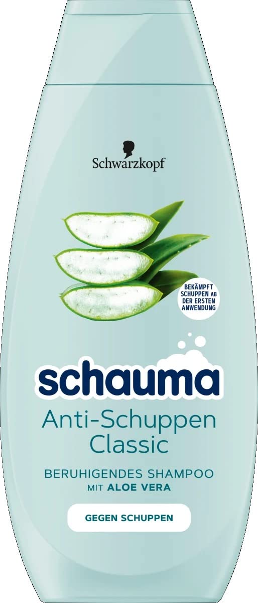Hi! I'm your shampoo this is how I take care of your hair: My cleansing and caring formula supports you in your fight against dandruff. It soothes your scalp and fights dandruff every day! My formula with aloe vera extract is vegan and silicone-free. I'm recycled: The body of my bottle is made of 50 recycled plastic and my lid is made of 25 recycled plastic. Remember to recycle me! To do so, separate the lid from the body of the bottle and dispose of both with plastic waste. How do you use me? Gently distribute the shampoo through damp hair and leave it on for a few moments. Remember to turn off the tap to save water. Then rinse your hair thoroughly. Schauma. Take care of what's important to you. DIRECTIONS FOR USE Gently distribute the shampoo through damp hair and leave it on for a few moments. Then rinse your hair thoroughly.Fights dandruff from the first application. SCHAUMA Classic Anti-Dandruff Shampoo with Aloe Vera to fight dandruff. For strong, healthy, dandruff-free hair. Works against itchy, irritated scalp. Frees dandruff and prevents its formation for up to 6 weeks (regular use for 6 weeks). Salut! Je suis votre shampoing voici comment je prends soin de vos cheveux : Ma formule lavante et soignante vous accompagne dans votre lutte contre les pellicules. Il apaise votre cuir chevelu et combat les pellicules au quotidien ! Ma formule à l'extrait d'aloe vera est vegan et sans silicone. Je suis recyclé : Le corps de ma bouteille est composé à 50 de plastique recyclé et mon couvercle est composé à 25 de plastique recyclé. Pensez à me recycler ! Pour ce faire, séparez le couvercle du corps de la bouteille et jetez les deux avec les déchets plastiques. Comment m'utilisez-vous ? Répartissez délicatement le shampooing sur cheveux humides et laissez agir quelques instants. N'oubliez pas de fermer le robinet pour économiser l'eau. Rincez ensuite soigneusement vos cheveux. Schauma. Prenez soin de ce qui est important pour vous. MODE D'EMPLOI Répartissez délicatement le shampooing sur cheveux humides et laissez agir quelques instants. Rincez ensuite soigneusement vos cheveux.Combat les pellicules dès la première application. SCHAUMA Shampooing anti-pelliculaire classique à l'aloe vera pour lutter contre les pellicules. Pour des cheveux forts et sains sans pellicules. Agit contre les démangeaisons et les irritations du cuir chevelu. Libère les pellicules et empêche leur formation jusqu'à 6 semaines (utilisation régulière pendant 6 semaines).