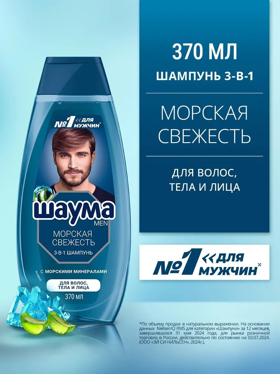 ШАУМА мужской шампунь Морская Свежесть 3-в-1 для волос, тела и лица. Увлажняет и укрепляет волосы, а также придает ощущение чистоты и свежести. Веган формула* с морскими минералами и алоэ вера без силиконови парабенов. *Не содержит ингредиентов животного происхождения.