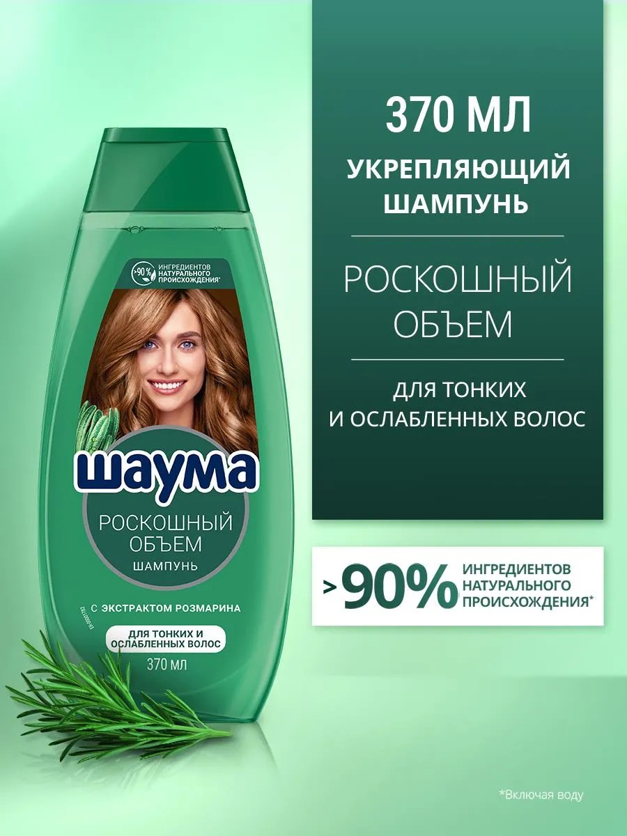 ШАУМА женский шампунь Роскошный Объем для тонких и ослабленных волос. Укрепляет структуру волос, придает упругость и эластичность, добавляя естественный объем прическе. Веган формула* с экстрактом розмарина, без силиконов и парабенов. *Не содержит ингредиентов животного происхождения.