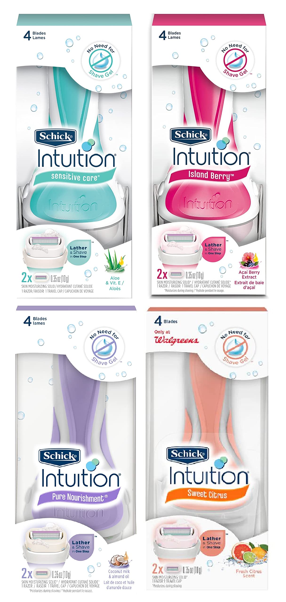 PIVOTING HEAD: That follows the contours of a woman's body to help minimize nicks and cuts. FOUR BLADES: That allow for a precise shave. Fresh Citrus - UNIQUE SKING CONDITIONING SOLID puts the shave cream right on the razor! Schick Intuition is the first and only razor system that lathers and moisturizes during shaving in one easy step - so there's no need to use shave gel. It also features a 4-blade pivoting head to glide smoothly along the contours of your legs and body. Island Berry - UNIQUE SKIN CONDITIONING SOLID formulated with Acai Berry that helps to moisturize skin during shaving and will leave skin smooth - and looking radiant. Sensitive Care - UNIQUE SKIN CONDITIONING SOLID: Enriched with Vitamin E and 100 percent natural Aloe for moisturizing sensitive skin during shaving. Also, Hypo Allergenic and gentle on your skin. Pure Nourishment - UNIQUE SKIN CONDITIONING SOLID infused with Coconut Milk and Almond Oil to help moisturize skin during shaving and will leave skin smooth - and you looking radiant. Lathers and moisturizes during shaving no need for soap, shave gel or body wash. A set of 4 different color handles, each with their own set of unique cartridge refills.