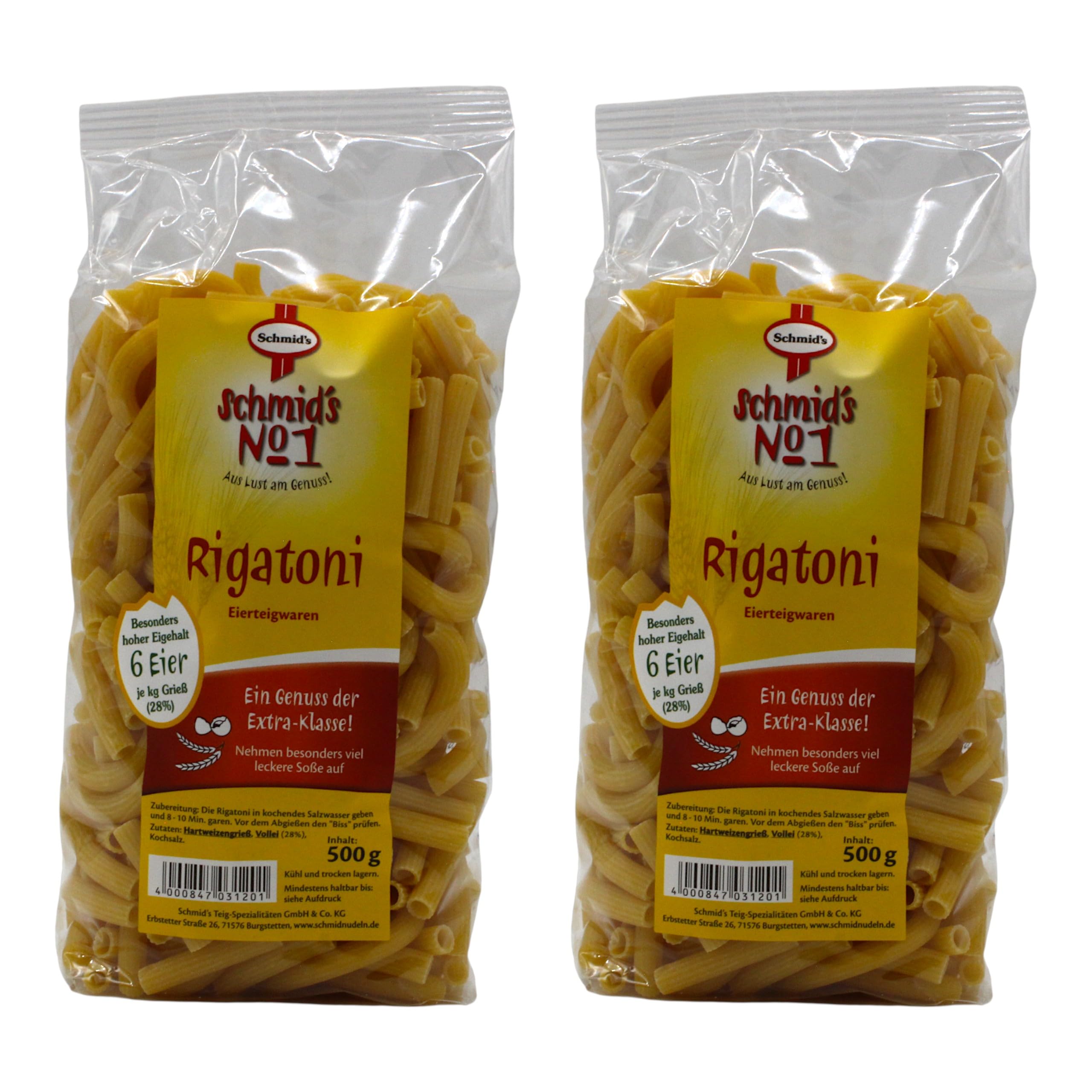 Schmid's No.1 - Premium pasta for a truly enjoyable experience - Discover pasta as it should be: full of flavor, with a perfect texture and superior quality. Schmid's No.1 delicacies are crafted using traditional methods and with the utmost care. Thanks to a particularly gentle process with long resting periods, the optimal pasta structure develops, resulting in a taste experience comparable to artisanal pasta. The typical tubular rigatoni shape with fine grooves and a deliberately rough surface ensures maximum sauce absorption. Every sauce clings intensely to the pasta, making every dish a delight for the palate, whether it's creamy sauces, rich meat stews, aromatic tomato sauces, or gratins. Thanks to the highest quality durum wheat semolina (SSSE) and 28 whole eggs (6 eggs per kg of semolina), these rigatoni impress with their natural color, robust flavor, and perfect bite. They remain firm, loose, and resilient during cooking without sticking or becoming soggy. Ideal as a main course, side dish, or for creative pasta creations – for everyone who appreciates quality, natural ingredients, and enjoyment. INGREDIENTS Durum wheat semolina, whole eggs (28 ), table saltSchmid's No.1 Rigatoni Pâtes de qualité supérieure avec bouchée parfaite et absorption maximale de la sauce, plein de goût pour de vrais moments de plaisir (2 x 500 g)DESCRIPTION DU PRODUIT DESCRIPTION DU PRODUIT Schmid's No.1 - Pâtes de qualité supérieure pour un véritable moment de plaisir - Découvrez les pâtes comme elles devraient être : pleine de goût, de consistance parfaite et de qualité supérieure. Les friandises Schmid's No.1 sont fabriquées selon l'art traditionnel et avec le plus grand soin. Grâce à un procédé particulièrement doux avec de longues périodes de repos, la structure optimale de la pâte peut se développer, pour une expérience gustative comme pour les pâtes artisanales. La forme tubulaire typique rigatoni avec des rainures fines et la surface délibérément rugueuse assurent une absorption maximale de la sauce. Chaque sauce adhère intensément aux pâtes et fait de chaque plat un régal pour le palais, qu'il s'agisse de sauces à la crème crémeuses, de ragouts de viande forts, de sauces tomates aromatiques ou de plats au four gratinés. Grâce à la semoule de blé dur de la plus haute qualité (SSSE) et à 28 d'œufs entiers (6 œufs par kg de semoule), les rigatoni convainquent par leur couleur naturelle, leur goût corsé et leur « morsure » parfaite. Elles restent fermes, lâches et résistantes à la cuisson sans coller ni devenir boueuses. Idéal comme plat principal, accompagnement ou pour des créations créatives de pâtes – pour tous ceux qui apprécient la qualité, le naturel et le plaisir. INGRÉDIENTS semoule de blé dur, œufs entiers (28 ), sel de table