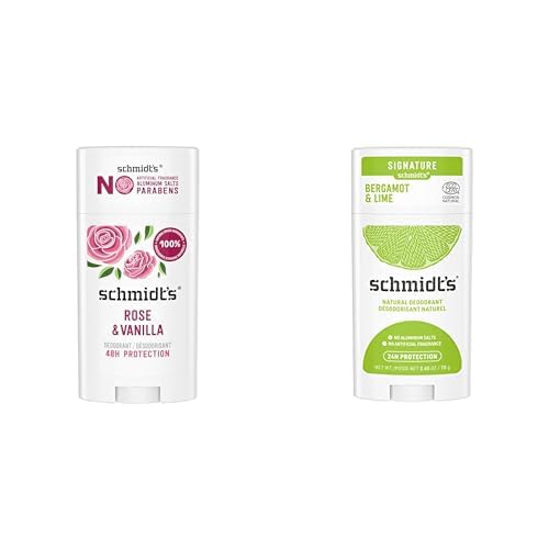 Schmidt's Déodorant d'Origine Naturelle Stick Rose et Vanille Efficacité 24h Certifié Vegan 75g Déodorant Stick Signature Bergamote et Citron Vert,Testé Dermatologiquement, 75g