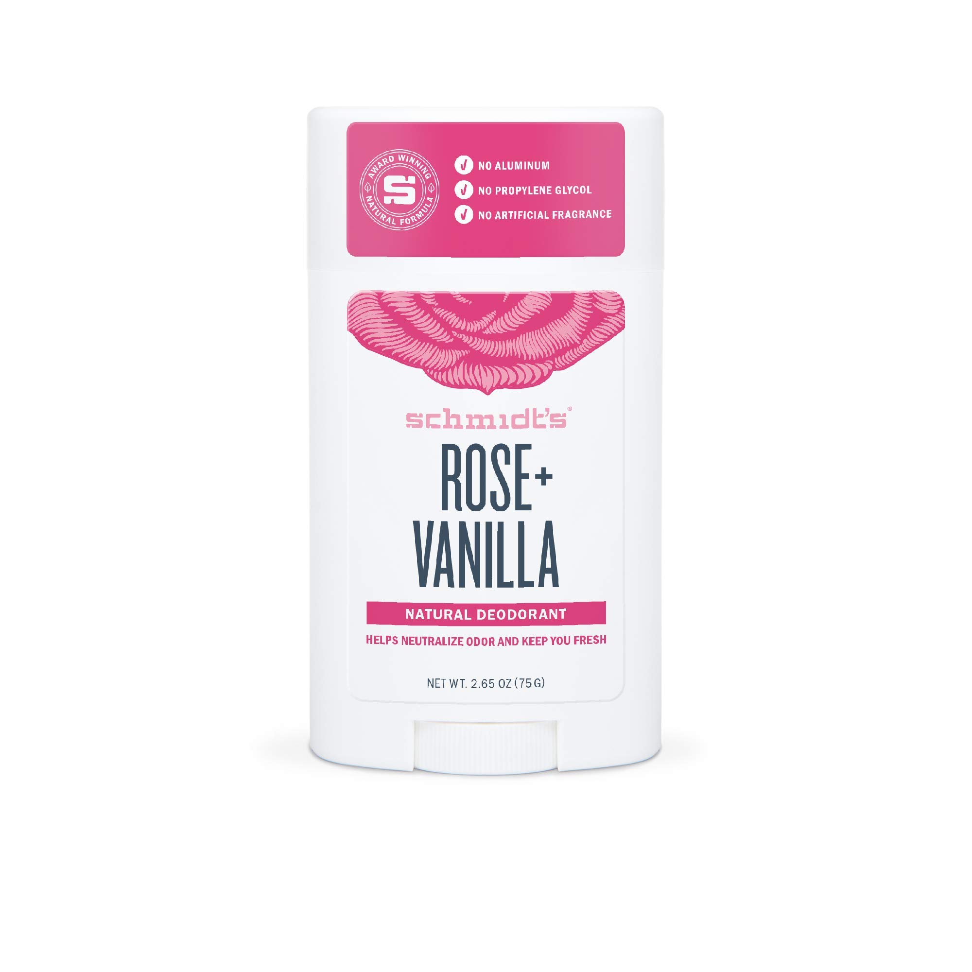 Schmidt's formulas are made with innovative ingredients, exclusively of plant and mineral origin, and are packed with natural benefits. Our mission is to make 100 natural products accessible to everyone. That's why we created a natural deodorant that not only smells delicious, but actually works. Schmidt's Signature Stick deodorants are free of aluminum salts and contain no artificial fragrances or colors. Our vegan deodorants help to naturally neutralize odor, absorb moisture, and work for a very long time. This Schmidt's Signature deodorant, suitable for both men and women, has a luxurious Rose Vanilla scent reminiscent of a bouquet of roses with warm notes of sweet vanilla. Our signature formula uses sodium bicarbonate (baking soda) and helps neutralize perspiration odor for natural, refreshing protection. A small amount is all you need for ultimate protection. The deodorant leaves no greasy or sticky residue and is easily absorbed. Before use, hold the product under your underarm skin to warm it and make it easier to apply. Then apply a small amount to your clean, dry underarms to feel fresh all day. Do not apply to irritated or damaged skin. HOW TO USE With its heavenly rose fragrance, Schmidt's Natural Rose Vanilla Deodorant is a truly refreshing experience. Our original formula uses sodium bicarbonate to neutralize odors and is slightly firmer than traditional deodorants. This compact formula provides special odor protection and requires only a small amount for a positive effect. Its texture is non-sticky and non-greasy and is easily absorbed—a little goes a long way. Simply hold the product against your skin for a moment to soften it with body heat. Then, gently apply a small amount to your underarms. This aluminum-free deodorant is for external use only. Do not use on broken skin. If skin irritation occurs, discontinue use. Keep out of reach of children.Absorbs quickly. Made with only plant and mineral-based ingredients. No artificial fragrance. Scented with essential oils. Helps naturally neutralize odors, absorb moisture, and lasts a very long time. Aluminum-free.Schmidt's Rouge déodorant naturel Rose Vanille - 1 x 75gDESCRIPTION DU PRODUIT DESCRIPTION DU PRODUIT Les formules de Schmidt sont composées d'ingrédients innovants, exclusivement d'origine végétale et minérale, et regorgent d'avantages naturels. Notre mission est de rendre les produits 100 naturels accessibles à tous. C'est pourquoi nous avons créé un déodorant naturel qui ne sent pas seulement délicieux, mais fonctionne vraiment. Les déodorants Signature Stick Schmidt sont exempts de sels d'aluminium et ne contiennent pas d'odeurs et de colorants artificiels. Nos déodorants végétaliens aident à neutraliser naturellement les odeurs, à absorber l'humidité et à fonctionner très longtemps. Ce déodorant Signature Schmidt, adapté aux hommes et aux femmes, a un parfum luxueux de Rose Vanilla et rappelle un bouquet de roses aux notes chaudes de vanille douce. Notre formule caractéristique utilise du bicarbonate de sodium (bicarbonate de soude) et aide à neutraliser les odeurs de sueur, pour une protection naturelle et rafraîchissante. Une petite quantité est nécessaire pour une protection ultime. Le déodorant ne donne pas de graisse et de collant, et est facilement absorbé. Avant utilisation, maintenez le produit sous la peau des aisselles pour réchauffer et faciliter l'application. Appliquez ensuite une petite quantité sur vos aisselles sèches et propres pour vous sentir frais toute la journée. Ne pas appliquer sur la peau irritée ou endommagée. MODE D'EMPLOI Avec son parfum rose céleste, le déodorant naturel rose vanille de Schmidt's est une véritable expérience de fraîcheur. Notre formule originale utilise du bicarbonate de sodium pour neutraliser les odeurs et est un peu plus ferme que les déodorants traditionnels. Cette formule compactée offre une protection spéciale contre les odeurs et nécessite une petite quantité pour obtenir un effet positif. Sa texture ne colle pas et ne graisse pas et est facilement absorbée - une petite quantité suffit. Il suffit de placer le produit sur la peau pendant un moment pour l'adoucir par contact avec la chaleur corporelle. Ensuite, appliquez une petite quantité doucement sur les aisselles. Le déodorant sans aluminium convient uniquement à un usage externe. Ne pas utiliser sur une peau blessée. En cas d'irritation de la peau, cessez de l'utiliser. Conserver hors de portée des enfants.Absorbe rapidement. Ingrédients d'origine végétale et minérale uniquement. Sans parfum artificiel. Odeur à base d'huiles essentielles. Aide à neutraliser naturellement les odeurs, à absorber l'humidité et à très longtemps. Sans sels d'aluminium.