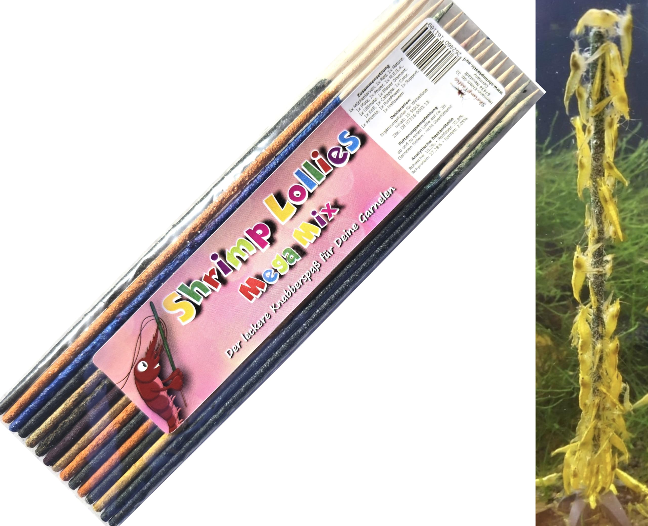 With our Mega Mix of shrimp lollipops, you can provide your shrimp with a varied diet by always feeding a different lollipop. The Super Mix pack contains: 1 Krill-Power Shrimp Lollipop. Ingredients: krill, floral pollen, bell pepper, minerals. 1 Red Mosquito Larva Shrimp Lollipop. Ingredients: red mosquito larvae, bell peppers. 1 Palatinate Edition Shrimp Lollipop. Ingredients: vine leaves, nettle, echinacea, spirulina, spinach, minerals. 1 Blue Diamond Shrimp Lollipop. Ingredients: minerals, grains, beta-glucan, blue spirulina powder. 1 PurePower Shrimp Lollipop. Ingredients: floral pollen. 1 Halloween Edition Shrimp Lollipop. Ingredients: bell peppers, floral pollen, Hokkaido, garlic. 1 Color-Boost Shrimp Lollipop. Ingredients: beetroot, bell pepper, floral pollen. Color: Dark red. 1 Power Shrimp Lollipop. Ingredients: Floral pollen, spirulina. Color: Light green, smooth surface. 1 Red Shrimp Lollipop. Ingredients: Bell peppers, floral pollen. Color: Red. 1 Plain Shrimp Lollipop. Ingredients: Spirulina, nettle, spinach. Color: Dark green, textured surface with light proportions. 1 M.E.G.A. Shrimp Lollipop. Ingredients: Moringa, echinacea, barley grass, brine shrimp. Color: Light green, textured surface. 1 Ultimate Shrimp Lollipop. Ingredients: Nettle, walnuts, spinach, seaweed, alfalfa, bell pepper, echinacea. Color: Dark green, textured surface. 1 Shrimp Lollipop Holder. Ingredients: Spirulina, minerals. Color: Dark green, slightly textured surface. 1 Catappa Shrimp Lollipop. Ingredients: nettle, walnut, spinach, seaweed, alfalfa, bell pepper, echinacea, almond leaves. Color: brown. 1 Artemia Power Shrimp Lollipop. Ingredients: artemia, carrots, floral pollen. Color: light brown to yellow, rough surface. Additives per kg: technological additives: carrageenan 0.3 . Declaration: Food supplement for invertebrates. (RN: 07 316 000 0846) Packaging: 15 x 1 piece 15 pieces per pack, in a resealable and sealed bag INDICATIONS All decorative shrimp, varied diet INGREDIENTS See label INSTRUCTIONS FOR USE See label See moreVaried food. An absolute treat for your animals. Strengthens the immune system. Balanced mix for a long lifespan for shrimp. 15 pieces with different varieties.Lot de 15 bâtonnets de sucettes pour crevettes et crevettesDESCRIPTION DU PRODUIT DESCRIPTION DU PRODUIT Avec notre Mega Mix de sucettes aux crevettes, vous pouvez nourrir vos crevettes de manière variée en nourrissant toujours une autre sucette. Le pack Super Mix contient : 1 sucettes crevettes Krill-Power. Composition : krill, pollen floral, poivron, minéraux. 1 sucettes crevettes larves de moustiques rouges. Composition : larves de moustiques rouges, poivrons. 1 sucettes à crevettes édition Palatinat. Composition : feuilles de vigne, ortie, échinacée, spiruline, épinards, minéraux 1 sucettes à crevettes diamant bleu. Composition : minéraux, céréales, bêta-glucane, poudre de spiruline bleue. 1 sucettes à crevettes PurePower. Composition : pollen floral. 1 sucettes crevettes édition Halloween. Composition : poivrons, pollen floral, hokkaido, ail 1 sucettes à crevettes Color-Boost. Composition : betterave, poivron, pollen floral. Couleur : rouge foncé. 1 sucettes crevettes Power. Composition : pollen floral, spiruline. Couleur : vert clair, surface lisse. 1 sucettes rouges pour crevettes. Composition : poivrons, pollen floral. Couleur : rouge. 1 sucettes crevettes nature. Composition : spiruline, ortie, épinards Couleur : vert foncé, surface rugueuse avec des proportions claires. 1 sucettes à crevettes M.E.G.A. Composition : moringa, échinacée, herbe d'orge, artémia. Couleur : vert clair, surface rugueuse. 1 sucettes crevettes Ultimate. Composition : ortie, noix, épinards, algues marines, luzerne, poivron, échinacée Couleur : vert foncé, surface rugueuse. 1 support pour sucettes crevettes. Composition : spiruline, minéraux Couleur : vert foncé, surface légèrement rugueuse. 1 sucettes crevettes Catappa. Composition : ortie, noix, épinards, algues marines, luzerne, poivron, échinacée, feuilles de badamier. Couleur : marron. 1 sucettes à crevettes Artemia Power. Composition : artemia, carottes, pollen floral. Couleur : marron clair à jaune, surface rugueuse. Additifs par kg : additifs technologiques : carraghénane 0,3 . Déclaration : Complément alimentaire pour invertébrés. (RN : 07 316 000 0846) Emballage : 15 x 1 pièce 15 pièces par paquet, dans un sachet refermable et scellé INDICATIONS toutes les crevettes décoratives, alimentation variée INGRÉDIENTS Voir étiquette MODE D'EMPLOI Voir étiquette Voir plusAlimentation variée. Un régal absolu pour vos animaux. Renforcent le système immunitaire. Mélange équilibré pour une longue durée de vie des crevettes. 15 pièces avec différentes variétés.