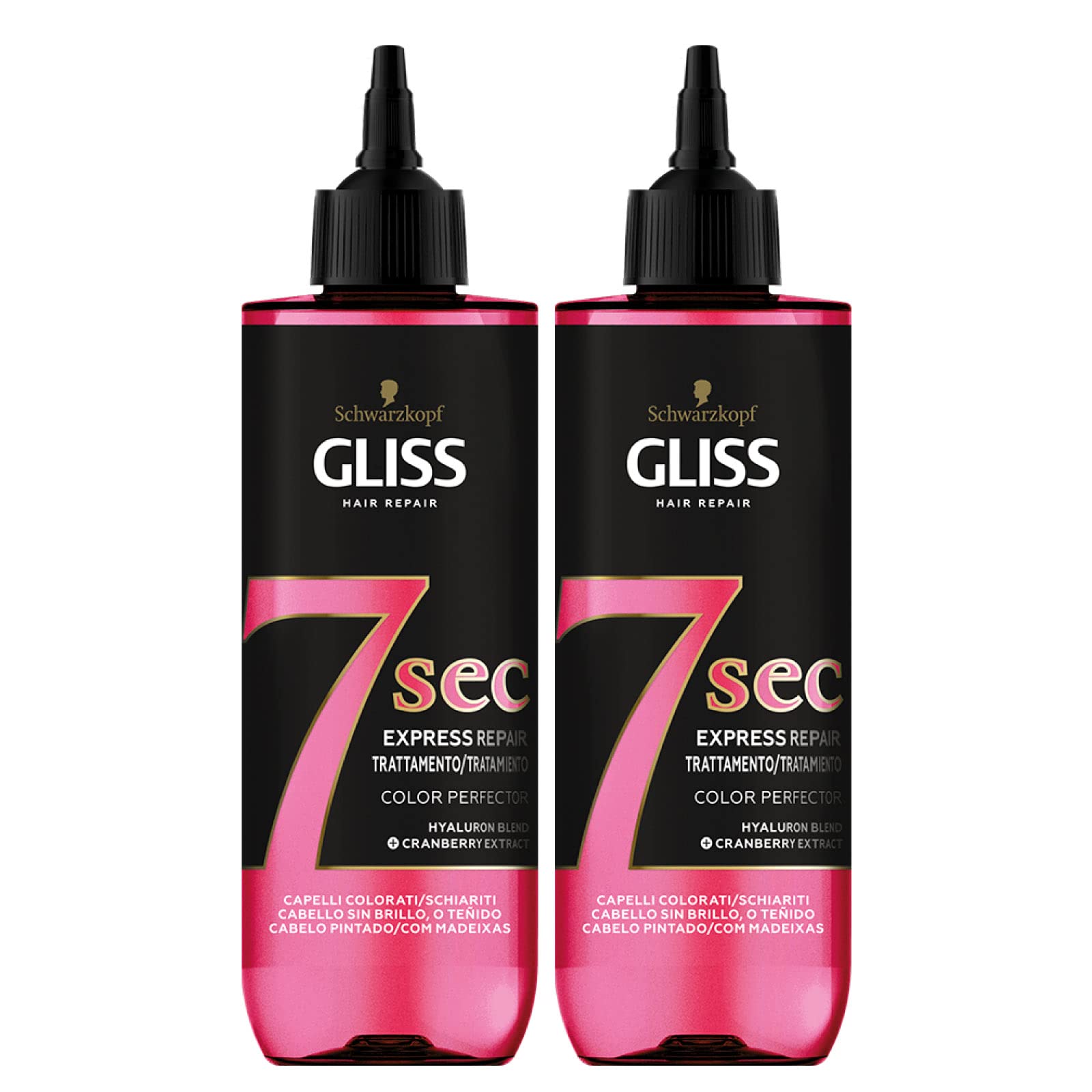 Schwarzkopf Gliss Hair Repair 7 sec Express Repair Color Perfector is a fast treatment for colored or lightened hair with brightening, protective, moisturizing and repairing effects. The formula with hyaluronic acid complex and cranberry extract makes it effective as a mask and provides an intense and natural color result in just 7 seconds. Apply directly and evenly to the lengths and ends of freshly washed and damp hair. DIRECTIONS FOR USE Wash freshly washed and damp hair. Apply the treatment evenly to the lengths and ends and leave on for 7 seconds. Then rinse and rinse hair.Apply directly and evenly to lengths and ends, on freshly washed and still damp hair. Provides an intense and natural color result in just 7 seconds. Its formula with hyaluron complex and cranberry extract makes it effective as a mask. Quickly treat colored or bleached hair with whitening, protective, moisturizing and restorative action. The set contains: 2 bottles of Schwarzkopf Gliss Hair Repair 7 sec. Express Repair Color Perfector 200 ml.Schwarzkopf Gliss Hair Repair 7 Sec Express Color Perfector behandeling voor gekleurd of gezuiverd haar, hydraterende actie, 2 flessen à 200 ml Schwarzkopf Gliss Hair Repair 7 sec Express Repair Color Perfector is een snelle behandeling voor gekleurd of lichter haar met helderende, beschermende, hydraterende en reparerende werking. De formule met hyaluroncomplex en cranberry-extract maakt het effectief als een masker en zorgt voor een intens en natuurlijk kleurresultaat in slechts 7 seconden. Direct en gelijkmatig op lengtes en punten aanbrengen, op vers gewassen en nog vochtig haar aanbrengen. GEBRUIKSAANWIJZING Vers gewassen en nog vochtig haar wassen. De behandeling gelijkmatig op lengtes en punten aanbrengen en 7 seconden laten werken. Vervolgens spoelen en haar uitspoelen.Direct en gelijkmatig op lengtes en punten, op vers gewassen en nog vochtig haar aanbrengen. Zorgt voor een intens en natuurlijk kleurresultaat in slechts 7 seconden. Zijn formule met hyaluroncomplex en cranberry-extract maakt het effectief als een masker. Snel behandelen van gekleurd of gebleekt haar met witmakende werking, beschermend, hydraterend en herstelend. De set bevat: 2 flessen Schwarzkopf Gliss Hair Repair 7 sec. Express Repair Color Perfector 200 ml.