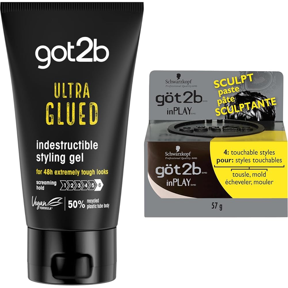 Schwarzkopf Got2b Ultra Glued Invincible Styling Gel, 170 Milliliter This Got2b gel's hold is no joke! So put it down and slowly back away if you're not up for the strongest gel hold ever! This non-sticky, no-flake formula is powered by high-tech styling agent - we call it Alpha XTR. Call it what you want, it lets you take your hair to new heights. Or do your own thing and cement your individual style. And when the party comes to an end, easily un-glue with a little shampoo. Go ahead - style away! Use on damp or dry hair. Squeeze a small amount into palms, rub hand together and distribute evenly throughout hair. göt2b glued Ultra Glued Gel has very strong ingredients that are designed to give your hair a great hold while styling when used as directed. High temperature conditions or direct exposure to skin, like securing a wig, may cause skin damage. Got2B InPLAY Sculpt Paste, 57 g Easily mold and shape that messy look - no bed required. Twist and turn your hair all you want, with got2b stackable inPLAY sculpt paste's rough finish, it will always look like you didn't even spend time on it. Got2b is the source to find the perfect hair styling products for your individual styling attitude. Inspired by the latest trends, Got2b products include serums, sprays, heat protectants, gels, lotions and mousse.Product 2: Micro particles spread evenly and easily. Product 2: Microgrip technology. Product 1: HOW TO USE: Use on damp or try hair. Squeeze a small amount into palms and distribute evenly throughout hair. Product 1: Great to use for vertical hair styles. Product 1: Lasts all night long, but once the fun is over, easily "un glue" with a little shampoo. Product 1: Provides no joke hold with a non-sticky, no-flake formula.