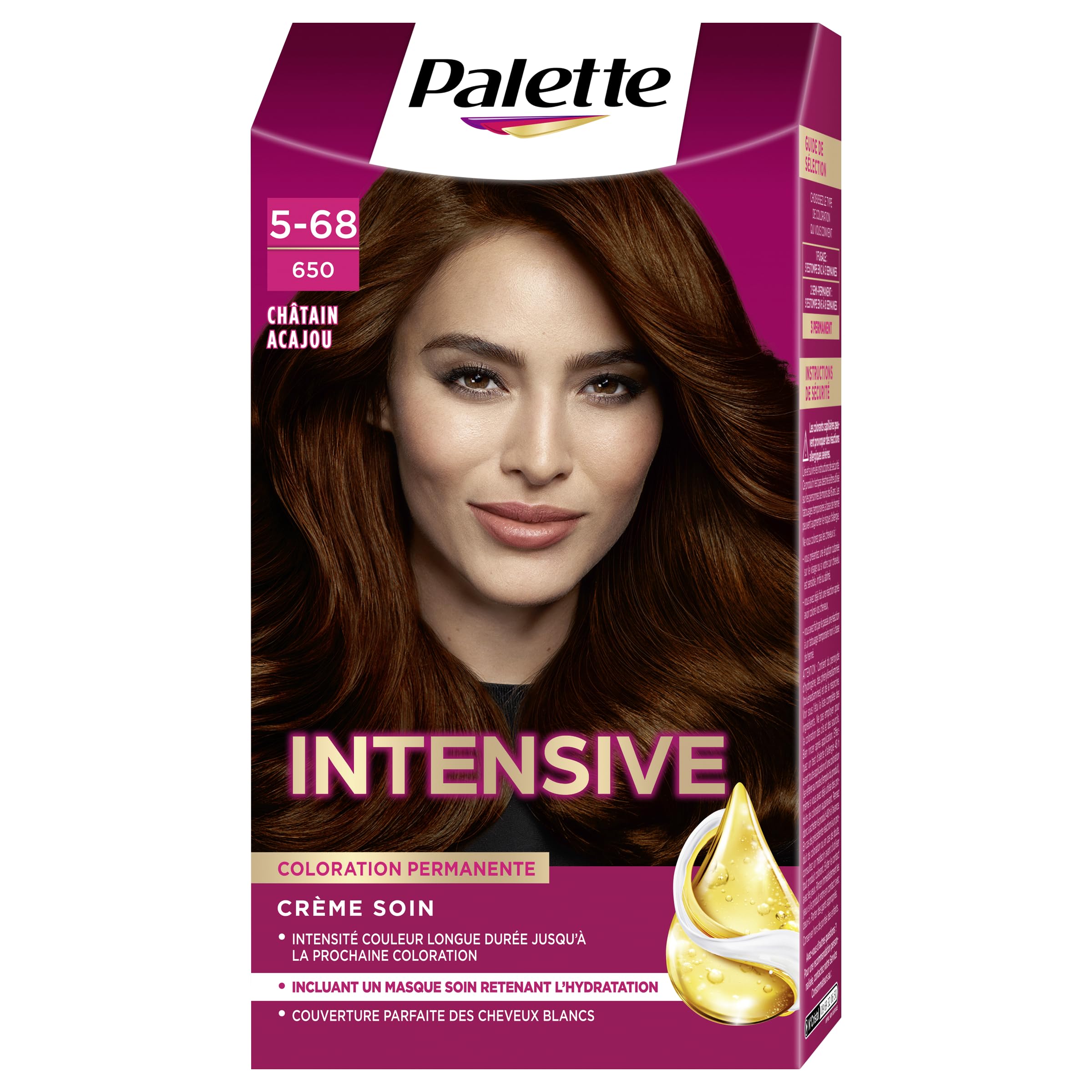 : With Schwarzkopf's Palette hair color, achieve rich, long-lasting color. Enjoy intense shine for up to 8 weeks and 100 gray coverage. Easy application: 1. Empty the contents of the color cream tube into the applicator bottle, close it, and mix well. 2. Apply the mixture to dry hair and leave on for 30 minutes. 3. Rinse thoroughly until the water runs clear. Then apply the nourishing conditioner included in the box. This kit contains: 1 tube of 50ml hair color cream, 1 applicator bottle with 50ml developer emulsion, 1 sachet of 15ml nourishing conditioner, 1 pair of gloves, and 1 instruction leaflet. Ingredients: HAIR COLOR CREAM: Aqua, Cetearyl Alcohol, Ammonium Hydroxide, Glyceryl Stearate, Prunus Amygdalus Dulcis Oil, Ceteareth-20, Octyldodecanol, Toluene-2.5-Diamine Sulfate, Sodium Laureth Sulfate, Parfum, Sodium Cetearyl Sulfate, Ethanolamine, Oleic Acid, Sodium Sulfite, Resorcinol, Potassium Stearate, Glycerin, Tetrasodium EDTA, 4-Amino-3-Nitrophenol, 2-Methylresorcinol, 2-Amino-3-Hydroxypyridine, Carbomer, Potassium Hydroxide, Serine Ascorbic Acid m-Aminophenol Sodium Sulfate Linalool Benzoic Acid DEVELOPING EMULSION: Aqua Hydrogen Peroxide Cetearyl Alcohol PEG-40 Castor Oil Disodium Pyrophosphate Sodium Cetearyl Sulfate Disodium EDTA Sodium Benzoate Phosphoric AcidNOURISHING TREATMENT: Aqua Cetearyl Alcohol Quaterni um-87 Argania Spinosa Kernel Oil Prunus Armeniaca Kernel Oil Panthenol Propylene Glycol Isopropyl Myristate Distearoylethyl Hydroxyethylmonium Methosulfate Citric Acid Stearamidopropyl Dimethylamine Phenoxyethanol Polyquaternium-37 Ceteareth-20 Glyceryl Stearate Sodium Methylparaben Dicaprylyl Carbonate Parfum Linalool Limonene Hexyl Cinnamal Benzyl Salicylate Lauryl Glucoside Citronellol Instructions for use: 1. Empty the contents of the color cream tube into the applicator bottle, close it, and mix well. 2. Apply the mixture to dry hair and leave on for 30 minutes. 3. Rinse thoroughly until the water runs clear. Then apply the nourishing conditioner included in the box. See more