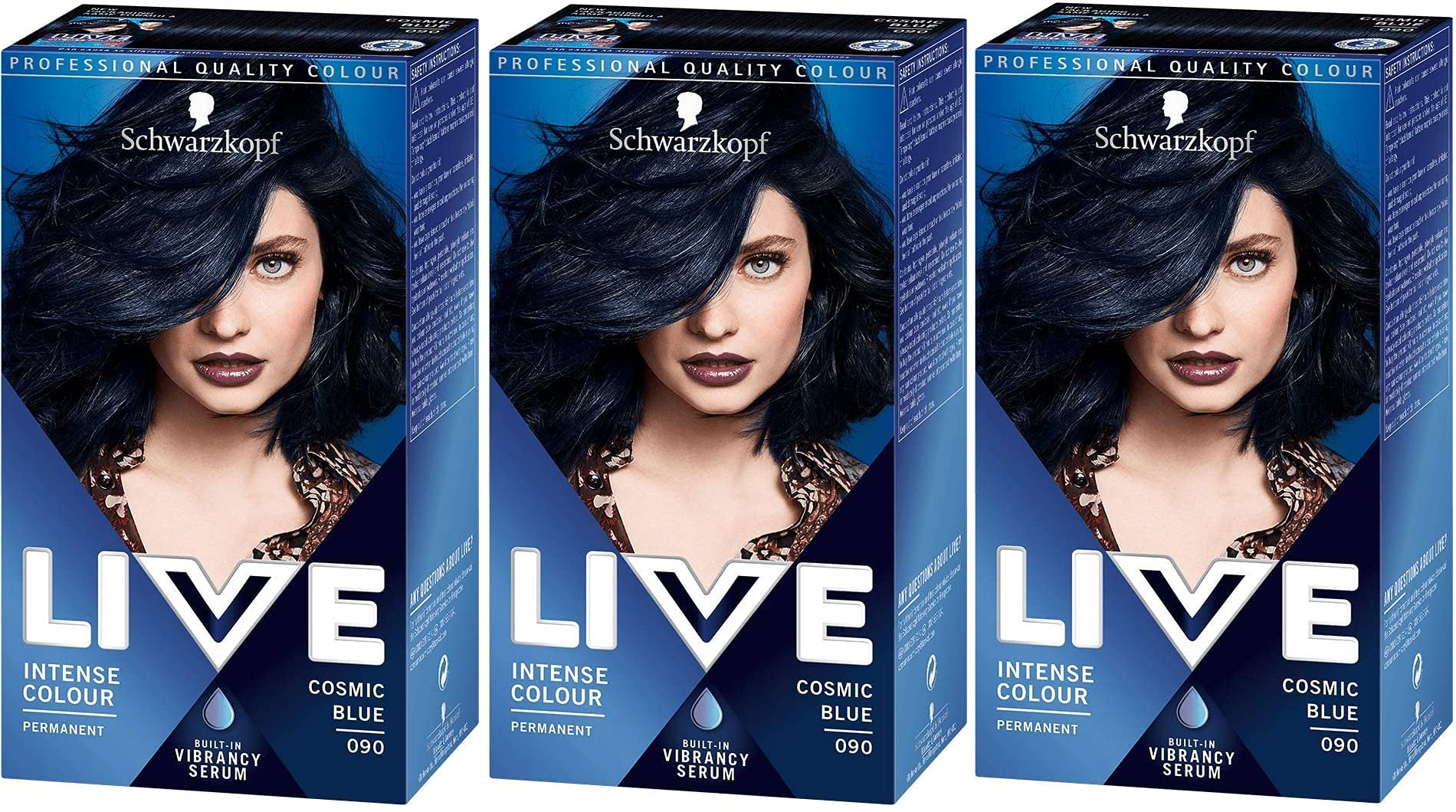 INGREDIENTS Aqua, Cetearyl Alcohol, Ammonium Hydroxide, Glyceryl Stearate, Ceteareth-20, Toluene-2,5-Diamine Sulfate, Ethanolamine, 2,4-Diaminophenoxyethanol HCl, Octyldodecanol, Sodium Laureth Sulfate, Sodium Cetearyl Sulfate, Serine, Prunus Armeniaca Kernel Oil, Parfum, Sodium Sulfite, Oleic Acid, Resorcinol, Potassium Stearate, Glycerin, Tetrasodium EDTA, Carbomer, Potassium Hydroxide, Ascorbic Acid, Linoleamidopropyl Chloride, PG-Dimonium Phosphate, Propylene Glycol, Sodium Sulfate, Benzoic AcidSemi-permanent hair color. Add conditioner to create a pastel shade or your own new color. Color cream only for intense color. Lasts up to 15 washes. For bleached blonde to dark blonde hair.Schwarzkopf Schwarzkopf Henkel Live XXL Colour Cosmic Blue Numéro 90 Lot de 3 bleu 3 count (Pack of 1)DESCRIPTION DU PRODUIT INGRÉDIENTS Aqua, Cetearyl Alcohol, Ammonium Hydroxide, Glyceryl Stearate, Ceteareth-20, Toluene-2,5-Diamine Sulfate, Ethanolamine, 2,4-Diaminophenoxyethanol HCl, Octyldodecanol, Sodium Laureth Sulfate, Sodium Cetearyl Sulfate, Serine, Prunus Armeniaca Kernel Oil, Parfum. um, sulfite de sodium e, acide oléique, résorcinol, stéarate de potassium, glycérine, EDTA tétrasodique, carbomère, hydroxyde de potassium, acide ascorbique, chlorure de linoléamidopropyl PG-Dimonium Phosphate, propylène glycol, sulfate de sodium, acide benzoïqueColoration semi-permanente pour cheveux. Ajoutez un après-shampoing pour créer une teinte pastel ou votre propre nouvelle couleur. Crème colorante uniquement pour obtenir une couleur intense. Dure jusqu'à 15 lavages. Pour cheveux blonds décolorés à blond foncé.
