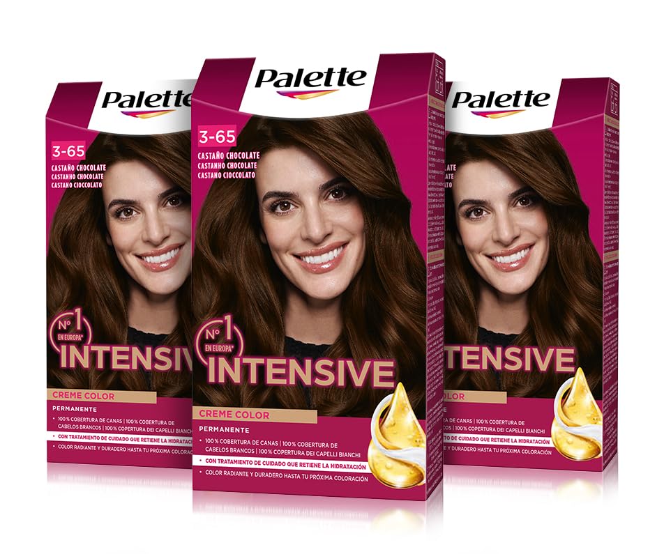 Schwarzkopf Palette Intensive - Permanent Hair Color - Vibrant, Radiant Color Lasting Up to 8 Weeks If you're looking for an effective hair color that delivers long-lasting results, the Schwarzkopf Palette Intensive Creme Color range of permanent hair dyes is the perfect solution for your hair. The color pigments developed by professional hairdressers and incorporated into this permanent dye penetrate deep into the hair shaft, completely covering gray hairs and giving them an intense, glossy color that lasts longer. In addition, the nourishing treatment with marula oil, applied after coloring, not only softens the hair's surface but also adds shine and vitality. Before applying, read the safety instructions and directions for use, and always perform a patch test. Product Details: Schwarzkopf Palette Intensive Creme Color Permanent Hair Color 100 Gray Coverage With natural marula oil. Long-lasting color results. Up to 8 weeks. Sensational shine. Contents: Pack of 3. Shade: 3.65 Chocolate Brown. Application: Wear the gloves, empty the contents of the color cream into the applicator bottle along with the developer emulsion and mix well. Apply the mixture to dry hair using the same bottle and wait 30 minutes. If you prefer to apply with a brush, empty the entire contents of the developer emulsion bottle and the color cream tube into a non-metallic bowl and mix well. Once the processing time is complete, rinse hair thoroughly with lukewarm water. No shampoo is needed. Then, apply the marula oil maintenance treatment included in the box. INSTRUCTIONS 1. Apply the dye to dry hair and do not rinse. 2. Leave the product on for the recommended time (depending on the desired color). 3. Rinse hair and apply the included conditioner. 4. Rinse again and comb through hair.Schwarzkopf Palette Intensive Teinture 3.65 Cheveux Châtain Chocolat - Parfaite couverture des cheveux - Coloration permanente Soin à l'huile de Marula - Couleur durable jusqu'à 8 semaines (lot de 3)DESCRIPTION DU PRODUIT DESCRIPTION DU PRODUIT Schwarzkopf Palette Intensive - Coloration permanente pour cheveux - Couleur vive, éclatante et durable jusqu'à 8 semaines Si vous recherchez une teinture efficace qui vous donne des résultats durables, la gamme de colorants permanents Palette Intensive Creme Color de Schwarzkopf est la solution parfaite pour vos cheveux. Les pigments de couleur développés par les coiffeurs professionnels incorporés dans cette teinture permanente pénètrent à l'intérieur du cheveu, recouvrant complètement les cheveux blancs et leur donnant une couleur intense et brillante plus longtemps. En outre, le soin nourrissant à l'huile de marula, applicable après la coloration, adoucit non seulement la surface du cheveu, mais lui apporte également brillance et vitalité. Avant l'application, lisez les consignes de sécurité et le mode d'emploi et faites toujours un test d'allergie cutanée. Détails du produit : Schwarzkopf Palette Intensive Creme Color Coloration Permanente Couverture 100 des cheveux blancs. Avec de l'huile de marula naturelle. Résultats de couleur durables. Jusqu'à 8 semaines. Brillance sensationnelle. Contenu : lot de 3. Teinte : 3,65 châtain chocolat. Application : Mettez les gants, videz le contenu de la crème colorante dans le flacon applicateur avec l'émulsion révélatrice et mélangez bien. Appliquez le mélange avec le même flacon sur cheveux secs et attendez 30 minutes. Si vous préférez appliquer au pinceau, videz tout le contenu du flacon d'émulsion révélatrice et du tube de crème colorante dans un bol non métallique et mélangez bien. Une fois le temps d'exposition terminé, rincez soigneusement les cheveux à l'eau tiède. Pas besoin de shampooing. Ensuite, appliquez le traitement d'entretien à l'huile de marula incluse dans la boîte. MODE D'EMPLOI 1. Appliquez la teinture sur cheveux secs et sans rinçage. 2. Laissez agir le produit pendant le temps recommandé (selon la couleur souhaitée). 3. Rincez les cheveux et appliquez l'après-shampooing inclus. 4. Rincez à nouveau et peignez les cheveux.
