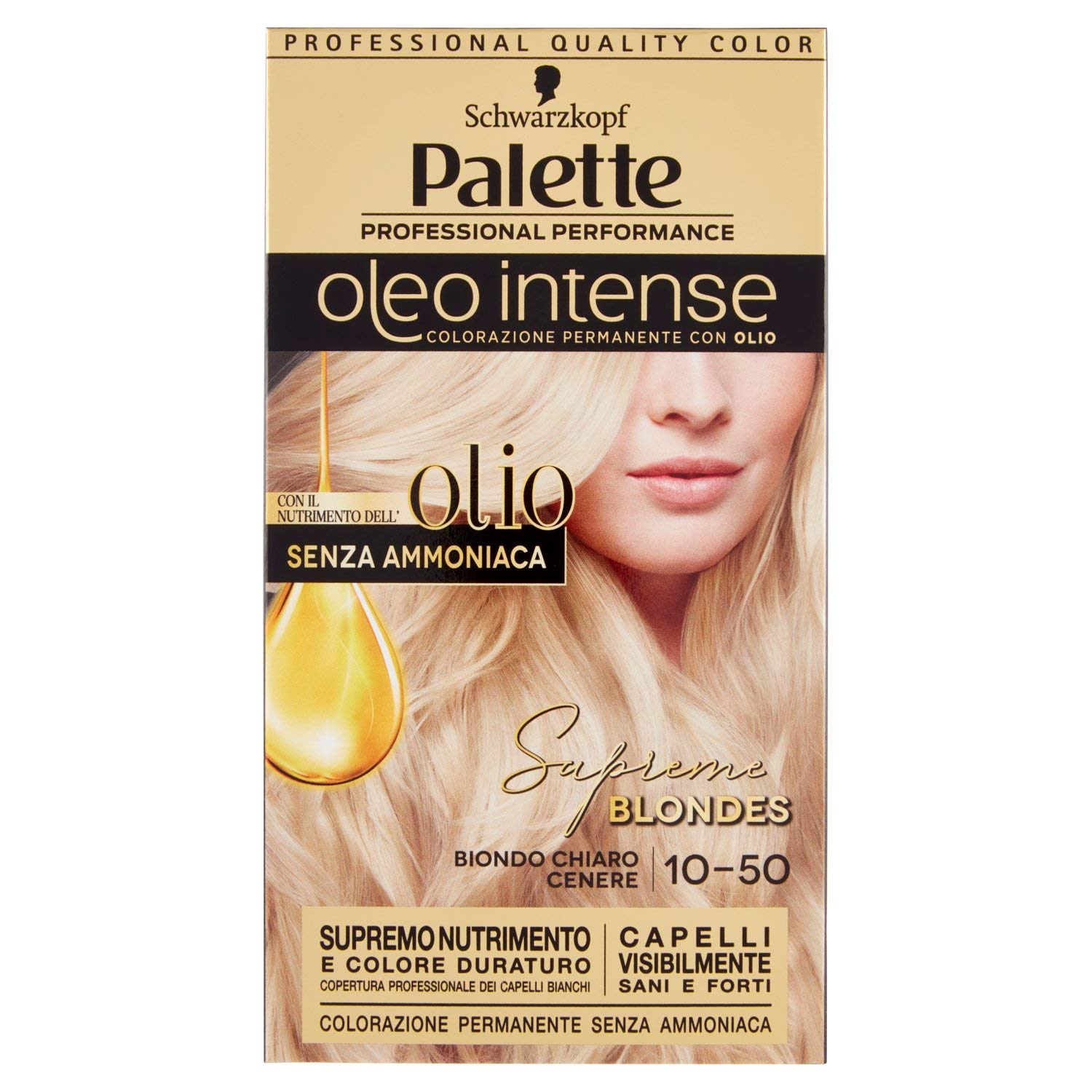 Schwarzkopf Palette Oleo Intense permanent hair color is designed to give hair intense, vibrant color and professional, long-lasting gray coverage. The ammonia-free formula and the conditioner containing argan oil, produced according to fair trade principles, nourish the hair, leaving it soft, silky, and shiny. The color pigments penetrate the hair fibers for supreme color intensity and longevity. An ideal permanent shade for vibrant color. INSTRUCTIONS FOR USE 1. Apply Schwarzkopf Palette Oleo Intense ammonia-free permanent hair color to the hair. 2. Wait the indicated processing time. 3. Rinse thoroughly. 4. Apply the conditioner enriched with argan oil. SAFETY WARNING For external use only. Avoid contact with eyes. Keep away from direct flame or heat sources. See moreShade: 10-50 Ash Blonde. Contents: 1 tube of conditioning color cream 50 ml, 1 applicator bottle with developer emulsion 50 ml, 1 sachet of conditioner 15 ml, 1 pair of gloves, and 1 instruction leaflet (French not guaranteed). Formula: The ammonia-free formula contains nourishing argan oil, produced according to fair trade principles and renowned for leaving hair soft, silky, and shiny. Benefits: Perfectly covers gray hair and intensely nourishes the hair after coloring, leaving hair visibly healthy and strong. Schwarzkopf Palette Oleo Intense: Ammonia-free permanent hair color for intense, long-lasting color guarantees professional gray coverage up to 100 .Schwarzkopf, Palette Oleo Intense, Coloration Permanente avec Huile, Teinte pour cheveux, Crème Colorante sans Ammoniaque, Couverture des Cheveux Blancs, Teinte 10-50 Blonde Cendre 10-50 Blond cendréDESCRIPTION DU PRODUIT DESCRIPTION DU PRODUIT Les teintes permanentes Schwarzkopf Palette Oleo Intense sont conçues pour donner des couleurs intenses et vives aux cheveux, pour une couverture professionnelle et durable des cheveux blancs. La formule sans ammoniaque et le baume contenant l'huile d'argan, produit selon les principes du commerce équitable nourrit les cheveux et les rend souples, soyeux et lumineux. Les pigments de couleur pénètrent les fibres du cheveu pour une intensité et une durée de vie suprême de la couleur. Une teinte permanente idéale pour une couleur vive. MODE D'EMPLOI 1. Appliquer la coloration permanente sans ammoniaque Schwarzkopf Palette Oleo Intense sur les cheveux. 2. Attendre le temps de pose indiqué. 3. Rincer abondamment. 4. Appliquer le baume enrichi en huile d'argan. AVERTISSEMENT DE SÉCURITÉ Usage extérieur uniquement. Évitez tout contact avec les yeux. Tenir à l'écart de la flamme nue directe ou de la source de chaleur. Voir plusTonalité : 10 – 50 blond cendré. Contenu de la livraison : 1 tube de crème colorante traitante 50 ml, 1 flacon applicateur avec émulsion révélatrice 50 ml, 1 sachet de baume 15 ml, 1 paire de gants et 1 notice d'instructions (français non garanti). Formule : la formule sans ammoniaque contient de l'huile d'argan nourrissante et produite selon les principes du commerce équitable et réputée pour rendre les cheveux doux, soyeux et lumineux. Avantages : couvre parfaitement les cheveux blancs et nourrit intensément le cheveu après la coloration, ce qui rend les cheveux visiblement sains et forts. Schwarzkopf Palette Oleo Intense : teinte permanente sans ammoniaque pour une couleur intense et durable garantit une couverture professionnelle des cheveux blancs jusqu'à 100 .