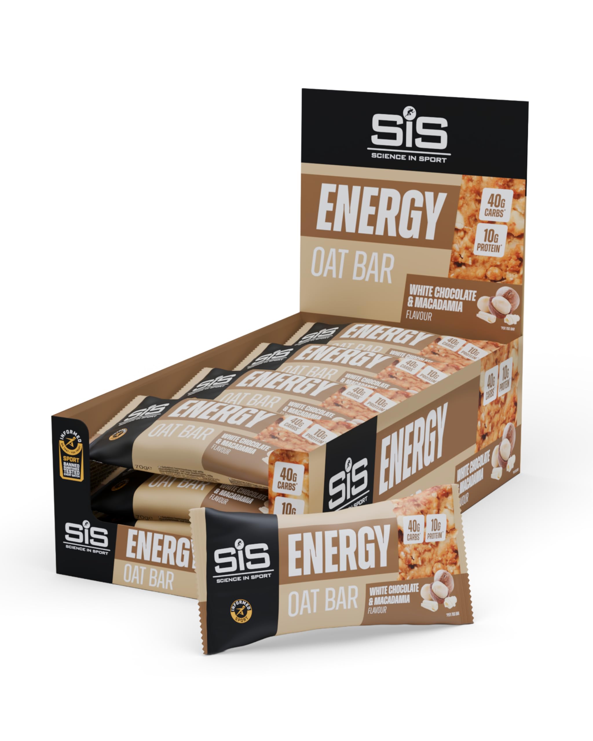 Whether you're heading out for a morning run, an afternoon workout, or recovering after an intense training session, the Energy Oat Bar is your perfect snack to keep you going. It's packed with wholegrain oat flakes and provides 40g of carbohydrates for sustained energy – ideal before a workout or competition. With 10g of protein, it helps your muscles repair and strengthen, whether before, during, or after exercise. And thanks to its natural fibers, it supports your digestion while keeping you feeling full for a while. Made with simple, high-quality ingredients, these bars are more than just a snack: they're a convenient (and delicious) way to keep up when you're on the go. Ingredients: Oat flakes (36 ), oat syrup, humectant (vegetable glycerin), rice flour, brown sugar, white chocolate chips (5 ) (sugar, cocoa butter, milk solids, emulsifier (soy lecithin), flavoring), macadamia nuts (5 ), soy protein crisps (5 ) (soy protein isolate, tapioca starch, salt), dates, pea protein, golden syrup, olive oil, coconut oil, soy protein, emulsifier (acacia gum), flavoring, salt. The white chocolate contains: a minimum of 24.9 cocoa butter.SIS QUALITY SINCE 1992 – Renowned for its expertise, SIS works with experts and top athletes to develop high-performance products. COMPACT AND CONVENIENT SIZE – Easily slip it into your gym bag or pocket. For sports, work, or travel. IDEAL BEFORE OR AFTER EXERCISE – Whether before a workout or after a run, this bar helps you maintain your energy and satiety. HIGH IN PROTEIN – With 10g of protein, each bar helps nourish your muscles and promote recovery after exercise. ENERGY SNACK FOR SPORTS – Designed to support your performance, with oats and 40g of carbohydrates per bar. Perfect for intense workouts.Description du produit Que tu partes pour un run matinal, une séance de sport l'après-midi ou que tu sois en pleine récup' après un entraînement intense, la barre Energy Oat Bar est ta collation parfaite pour tenir la distance. Elle est bourrée de flocons d'avoine complets et t'apporte 40 g de glucides pour une énergie qui dure – nickel avant un entraînement ou une compet'. Avec ses 10 g de protéines, elle aide tes muscles à se réparer et à se renforcer, que ce soit avant, pendant ou après l'effort. Et grâce à ses fibres naturelles, elle soutient ta digestion tout en te calant pour un bon moment. Faites avec des ingrédients simples et de qualité, ces barres sont plus qu'un simple snack : c'est un moyen pratique (et super bon) de suivre le rythme quand tu bouges beaucoup. Ingrédients Ingrédients : Flocons d'avoine (36 ), sirop d'avoine, agent humectant (glycérine végétale), farine de riz, sucre brun, pépites de chocolat blanc (5 ) (sucre, beurre de cacao, matières solides du lait, émulsifiant (lécithine de soja), arôme), noix de macadamia (5 ), croustillants de protéine de soja (5 ) (isolat de protéine de soja, amidon de tapioca, sel), dattes, protéine de pois, sirop doré, huile d'olive, huile de coco, protéine de soja, émulsifiant (gomme d'acacia), arôme, sel. Le chocolat blanc contient : au minimum 24,9 de beurre de cacao.QUALITÉ SIS DEPUIS 1992 – Reconnue pour son expertise, SIS travaille avec des experts et des sportifs de haut niveau pour développer des produits performants. FORMAT COMPACT ET PRATIQUE – Glissez-la facilement dans votre sac de sport ou votre poche. Pour le sport, le travail ou les déplacements. IDÉALE AVANT OU APRÈS L'EFFORT – Que ce soit avant un entraînement ou après une sortie, cette barre vous aide à garder votre énergie et votre satiété. RICHE EN PROTÉINES – Avec 10g de protéines, chaque barre aide à nourrir vos muscles et à favoriser la récupération après l'effort. COLLATION ÉNERGÉTIQUE POUR LE SPORT – Conçue pour soutenir vos performances, avec de l'avoine et 40g de glucides par barre. Parfait pour les séances de sport intenses.Science in Sport Barre Énergétique à l'Avoine 70g x12 Chocolat Blanc Macadamia – 40g de glucides et 10g de protéines, collation gourmande pour vos séances sportives Chocolat blanc et noix de macadamia 1 unité (Lot de 12)