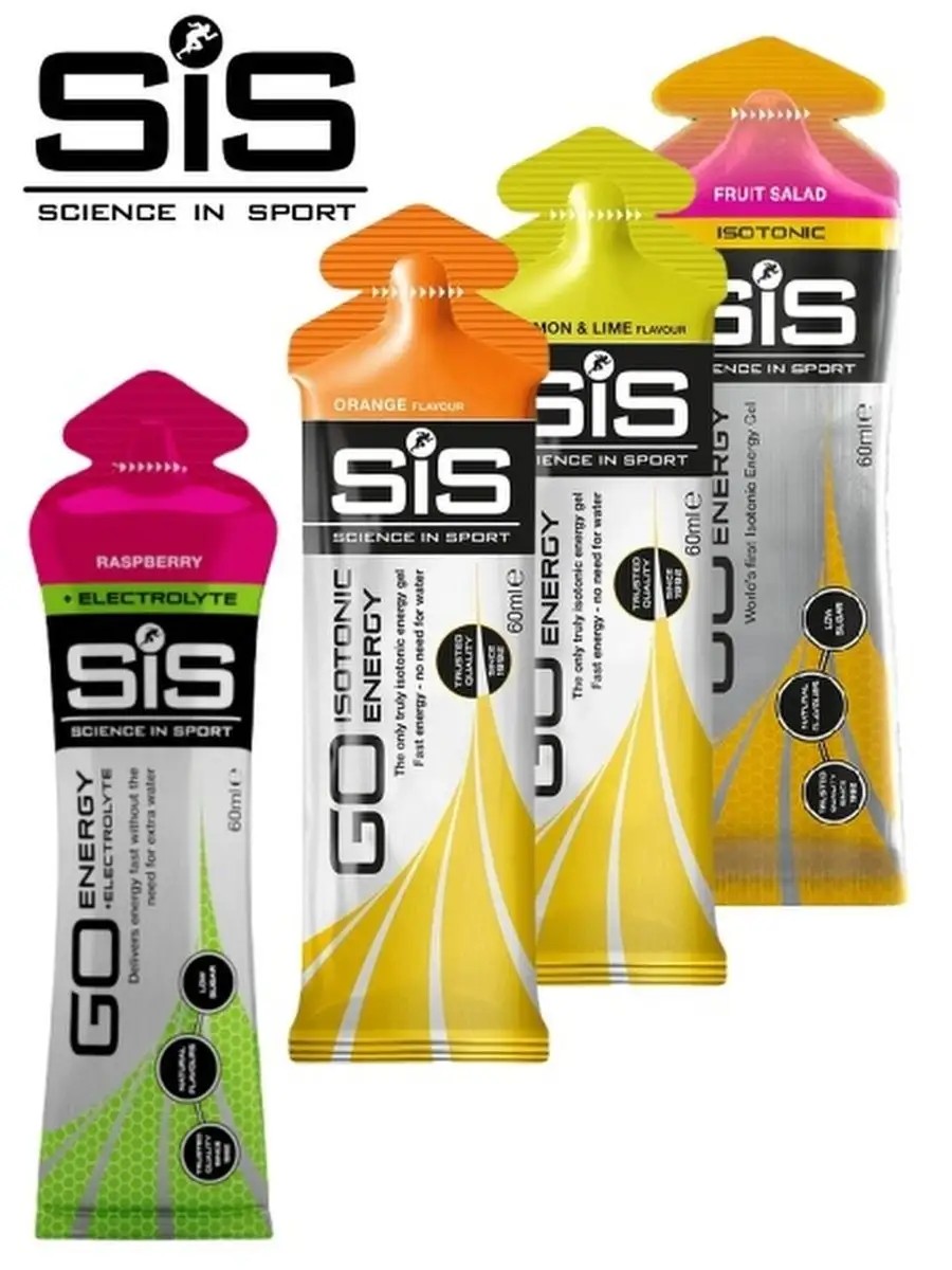 A mix of 4 flavors of Science in Sports (SIS) carbohydrate gels, 60 ml each. The electrolyte gel replenishes important micronutrients lost through sweat. SIS isotonic energy gel was developed and patented by British scientists as the world's first liquid isotonic energy gel that does not require water. SiS gels contain 22 g of carbohydrates, and the electrolyte gel also contains all the necessary electrolytes, including 118 mg of sodium, 9.5 mg of potassium, and 1.5 mg of magnesium.