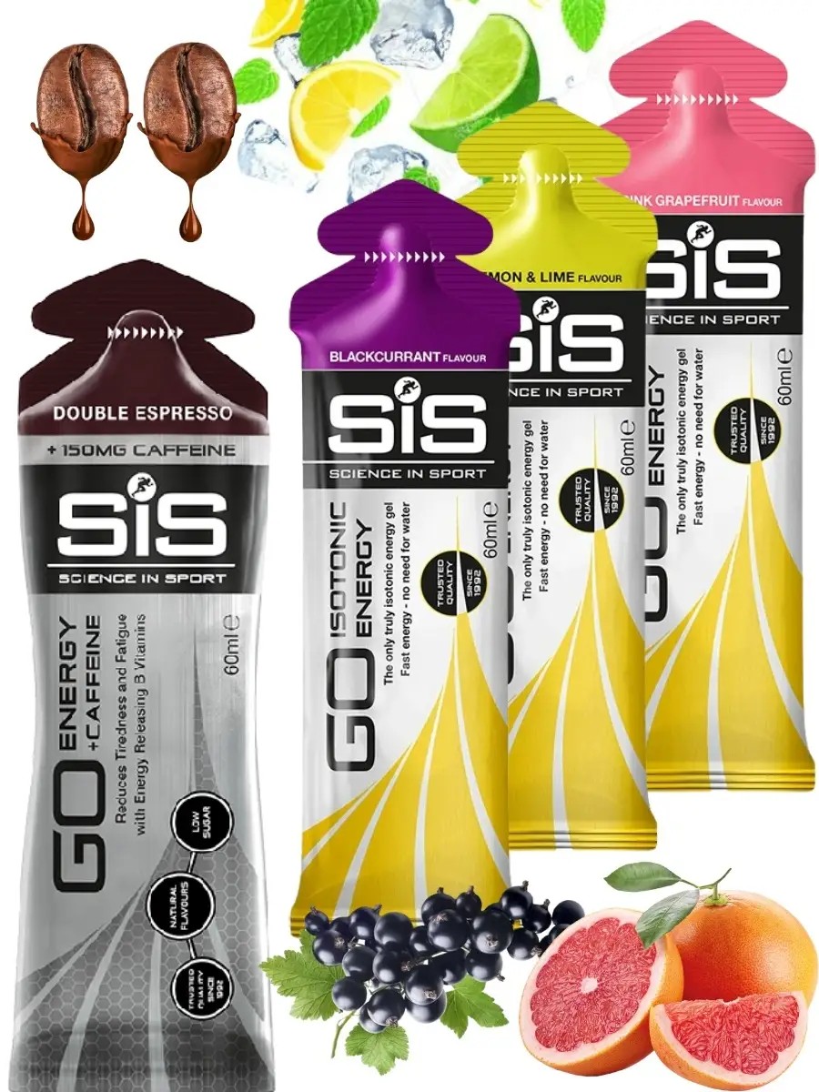 A mix of 4 flavors of Science in Sports (SIS) carbohydrate gels, 60 ml each. The caffeinated gel is used in the final stages of long-distance runs. SIS Go Isotonic Gel was developed and patented by British scientists as the world's first liquid isotonic energy gel that does not require water.