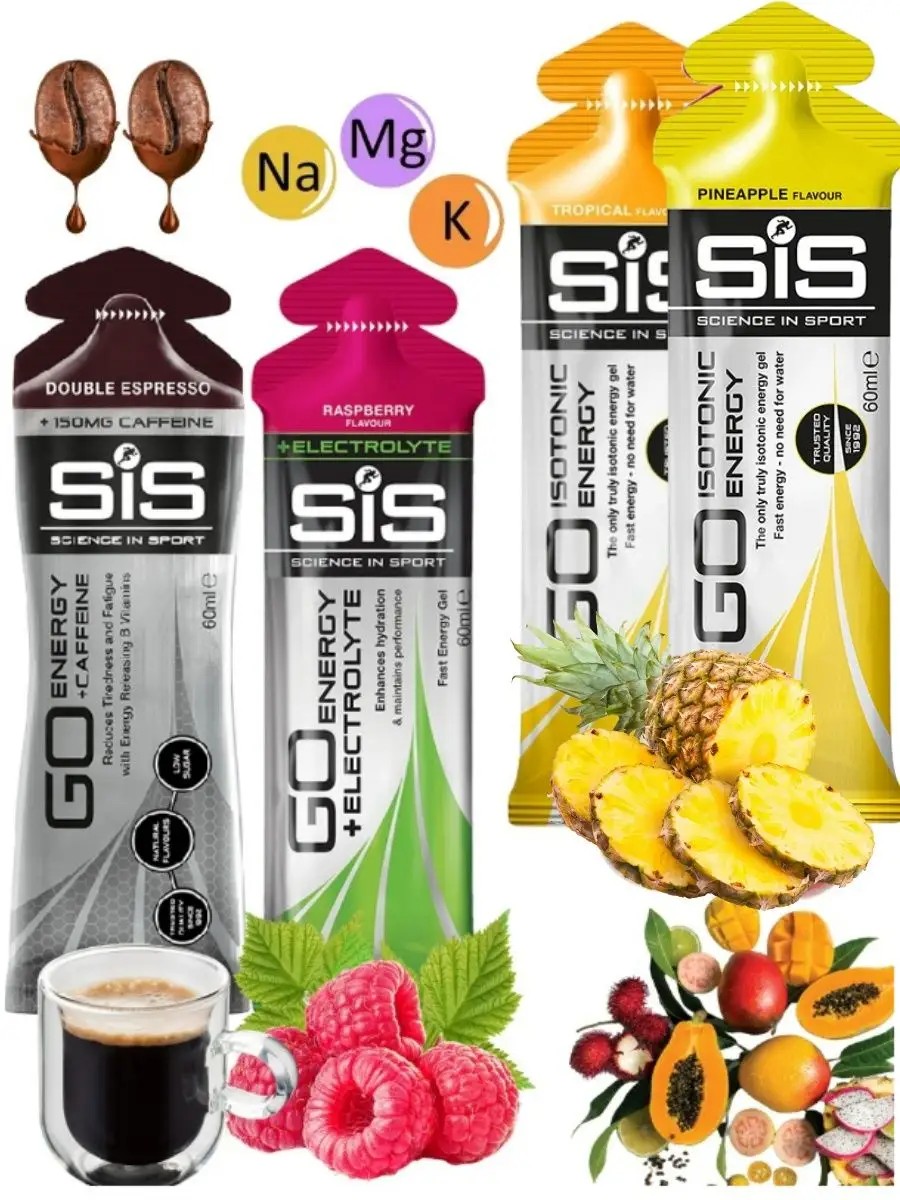 ----> THE EXPIRY DATE is printed on the top end of the package with an embossed stamp in the format "MONTH (three English LETTERS) YEAR (two digits)"!!! A mix of 4 flavors of Science in Sports (SIS) carbohydrate gels, 60 ml each. SiS gels with electrolytes replenish important micronutrients lost through sweat. The gel with caffeine is used in the final stages of long-distance runs. SIS isotonic energy gel was developed and patented by British scientists as the world's first liquid isotonic energy gel that does not require water. The running gel contains 22 g of carbohydrates. The simple carbohydrates in SIS Go Isotonic Gel quickly provide energy, thanks to its easily digestible formula, which doesn't retain them in the stomach. Its light texture and subtle, non-sugary flavor leave your mouth feeling refreshed. Start consuming SIS gels 30-40 minutes after your workout begins, and then one gel every 20-25 minutes, depending on the duration. During competitions, begin consuming 20-25 minutes after the start.