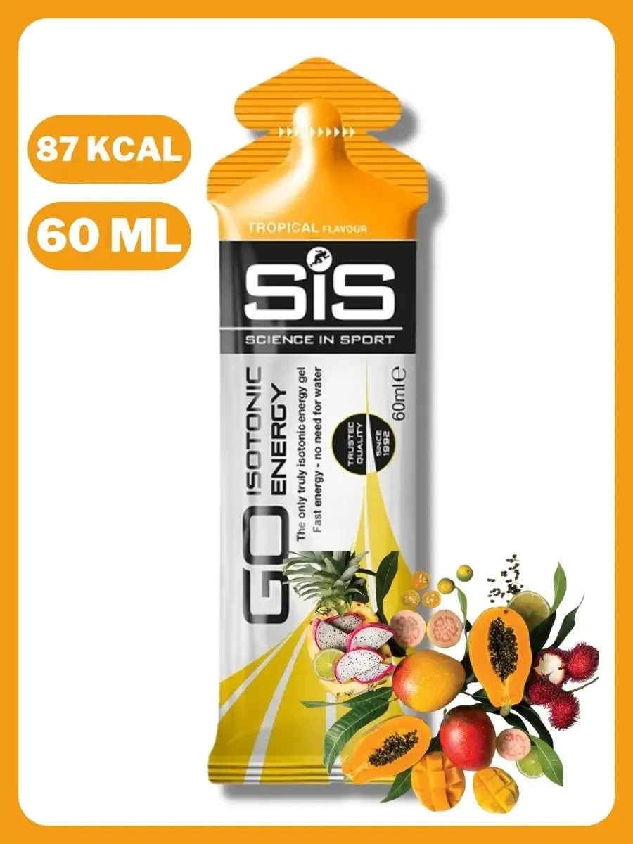 SIS Energy Gels for Running and Marathon Science in Sports (SIS) 60 ml with tropical flavor are used during training and competitions. SIS isotonic energy gel was developed and patented by British scientists as the world's first liquid energy gel SIS isotonic gel that does not need to be washed down with water. Contains 22 g of carbohydrates.