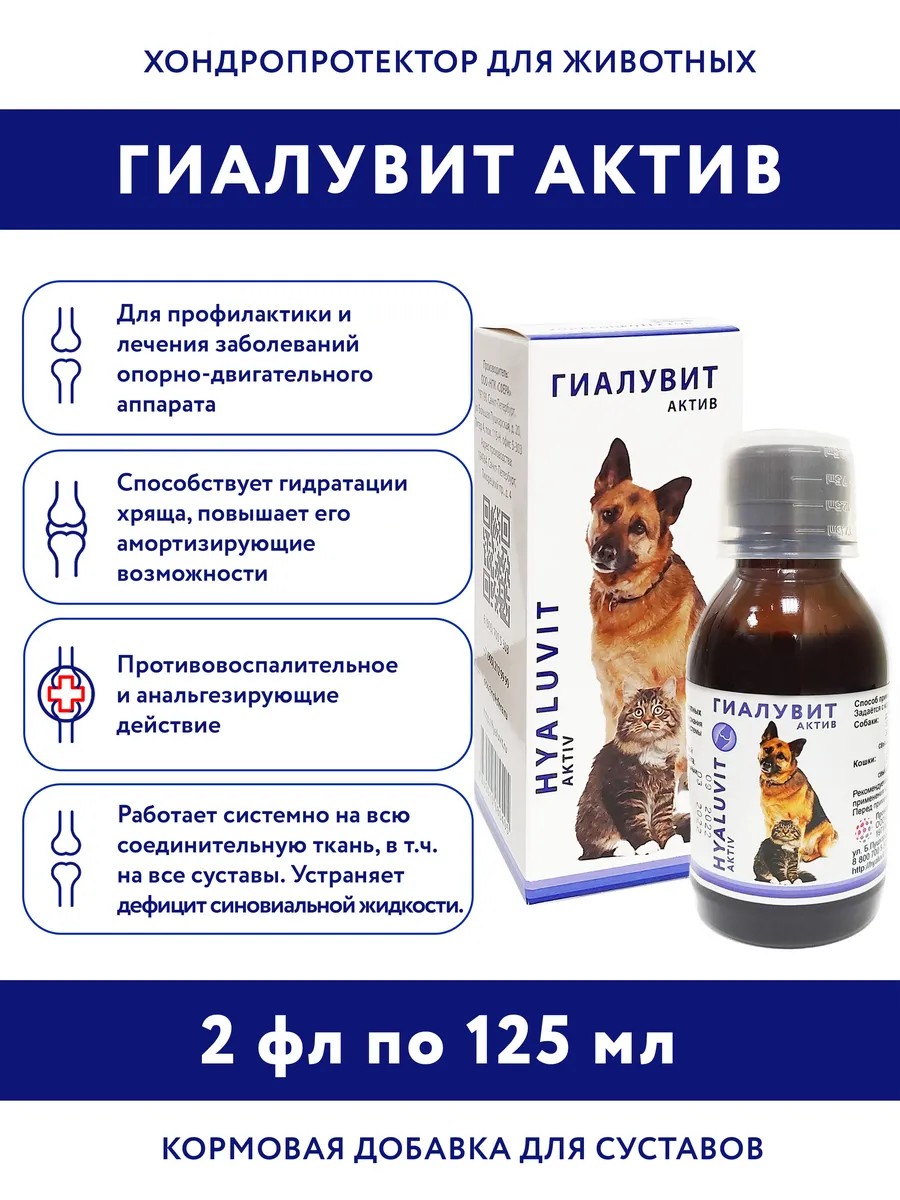 Гиалувит Актив, применяется для профилактики и лечения заболеваний опорно-двигательного аппарата животных. Содержит комплекс гиалуроновой кислоты и хондроитин сульфата, витамин Е и комплекс минеральных веществ в хелатной форме. Фасовка 125 мл - для собак и кошек.