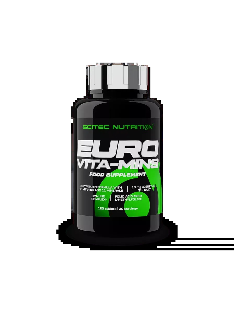 The Euro Vita-Mins vitamin complex is a source of the most important vitamins and minerals for the body in significant doses. Vitamin C supports the functioning of the immune and nervous systems, as well as the reduction of tiredness and fatigue. Vitamin B2 helps maintain normal vision and normal red blood cells. Zinc ensures normal fertility, reproduction, and the maintenance of normal testosterone levels, and is also important for the normal metabolism of macronutrients. Selenium improves the condition of hair and nails and protects cells from oxidative stress. Coenzyme Q10 is a substance involved in cellular energy production. Organs with high energy requirements—such as the heart, liver, and kidneys—have the highest concentrations of coenzyme Q10. Suggested Use: Take 4 tablets daily with meals. You can take all 4 tablets at once or split the dose: 2 with breakfast and 2 with dinner.