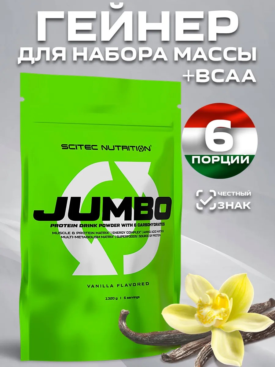 Jumbo, верный своему названию, помогает тем, кто хочет набрать массу, легче достичь избытка калорий с помощью своих больших порций. Он содержит 135 г углеводов и 53 г белка на порцию, значительно увеличивая количество макронутриентов, потребляемых в день, и, следовательно, количество калорий, потребляемых ежедневно.